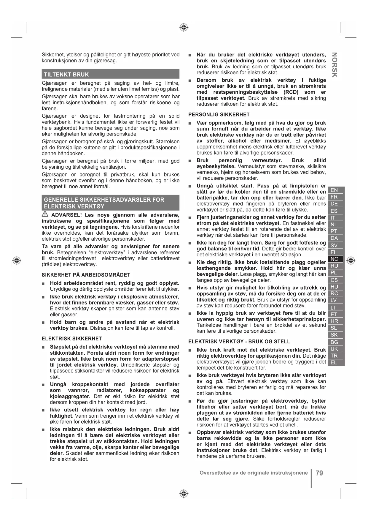 Alkuperäisten ohjeiden suomennosSikkerhet, ytelser og pålitelighet er gitt høyeste prioritet ved konstruksjonen av din gjæresag. TILTENKT BRUK Gjærsagen er beregnet på saging av hel- og limtre, trelignende materialer (med eller uten limet ferniss) og plast. Gjærsagen skal bare brukes av voksne operatører som har lest instruksjonshåndboken, og som forstår risikoene og farene. Gjærsagen er designet for fastmontering på en solid verktøybenk. Hvis fundamentet ikke er forsvarlig festet vil hele sagbordet kunne bevege seg under saging, noe som øker muligheten for alvorlig personskade. Gjærsagen er beregnet på skrå- og gjæringskutt. Størrelsen på de forskjellige kuttene er gitt i produktspesifi kasjonene i denne håndboken. Gjærsagen er beregnet på bruk i tørre miljøer, med god belysning og tilstrekkelig ventilasjon. Gjærsagen er beregnet til privatbruk, skal kun brukes som beskrevet ovenfor og i denne håndboken, og er ikke beregnet til noe annet formål.