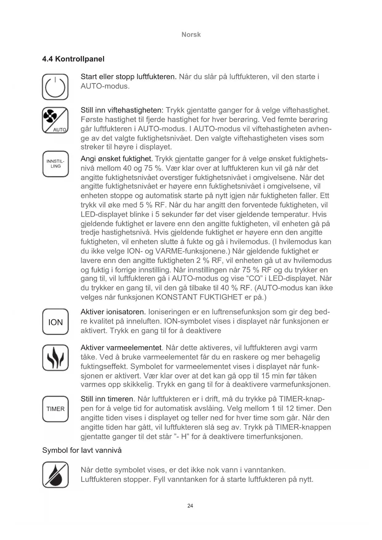 Modell: WHU600 Strømforsyning: 220–240 V 50/60 Hz Varmeeffekt: 80 W Fukteeffekt: 30 W Total effekt: 110 W Kapasitet vanntank: 5,5 l Fordampningshastighet: ≥300 ml/h Støynivå: ≤35 dB(A) Norsk *Tekniske endringer og forbedringer kan forekomme. Alle verdier er omtrentlige og kan variere med eksterne forhold som temperatur, ventilasjon og luftfuktighet.24 ION TIMER Start eller stopp luftfukteren. Når du slår på luftfukteren, vil den starte i AUTO-modus. Still inn viftehastigheten: Trykk gjentatte ganger for å velge viftehastighet. Første hastighet til fjerde hastighet for hver berøring. Ved femte berøring går luftfukteren i AUTO-modus. I AUTO-modus vil viftehastigheten avhen- ge av det valgte fuktighetsnivået. Den valgte viftehastigheten vises som streker til høyre i displayet. Angi ønsket fuktighet. Trykk gjentatte ganger for å velge ønsket fuktighets- nivå mellom 40 og 75 %. Vær klar over at luftfukteren kun vil gå når det angitte fuktighetsnivået overstiger fuktighetsnivået i omgivelsene. Når det angitte fuktighetsnivået er høyere enn fuktighetsnivået i omgivelsene, vil enheten stoppe og automatisk starte på nytt igjen når fuktigheten faller. Ett trykk vil øke med 5 % RF. Når du har angitt den forventede fuktigheten, vil LED-displayet blinke i 5 sekunder før det viser gjeldende temperatur. Hvis gjeldende fuktighet er lavere enn den angitte fuktigheten, vil enheten gå på tredje hastighetsnivå. Hvis gjeldende fuktighet er høyere enn den angitte fuktigheten, vil enheten slutte å fukte og gå i hvilemodus. (I hvilemodus kan du ikke velge ION- og VARME-funksjonene.) Når gjeldende fuktighet er lavere enn den angitte fuktigheten 2 % RF, vil enheten gå ut av hvilemodus og fuktig i forrige innstilling. Når innstillingen når 75 % RF og du trykker en gang til, vil luftfukteren gå i AUTO-modus og vise “CO” i LED-displayet. Når du trykker en gang til, vil den gå tilbake til 40 % RF. (AUTO-modus kan ikke velges når funksjonen KONSTANT FUKTIGHET er på.) Aktiver ionisatoren. Ioniseringen er en luftrensefunksjon som gir deg bed- re kvalitet på inneluften. ION-symbolet vises i displayet når funksjonen er aktivert. Trykk en gang til for å deaktivere Aktiver varmeelementet. Når dette aktiveres, vil luftfukteren avgi varm tåke. Ved å bruke varmeelementet får du en raskere og mer behagelig fuktingseffekt. Symbolet for varmeelementet vises i displayet når funk- sjonen er aktivert. Vær klar over at det kan gå opp til 15 min før tåken varmes opp skikkelig. Trykk en gang til for å deaktivere varmefunksjonen. Still inn timeren. Når luftfukteren er i drift, må du trykke på TIMER-knap- pen for å velge tid for automatisk avslåing. Velg mellom 1 til 12 timer. Den angitte tiden vises i displayet og teller ned for hver time som går. Når den angitte tiden har gått, vil luftfukteren slå seg av. Trykk på TIMER-knappen gjentatte ganger til det står ”- H” for å deaktivere timerfunksjonen. Når dette symbolet vises, er det ikke nok vann i vanntanken. Luftfukteren stopper. Fyll vanntanken for å starte luftfukteren på nytt. Symbol for lavt vannivå