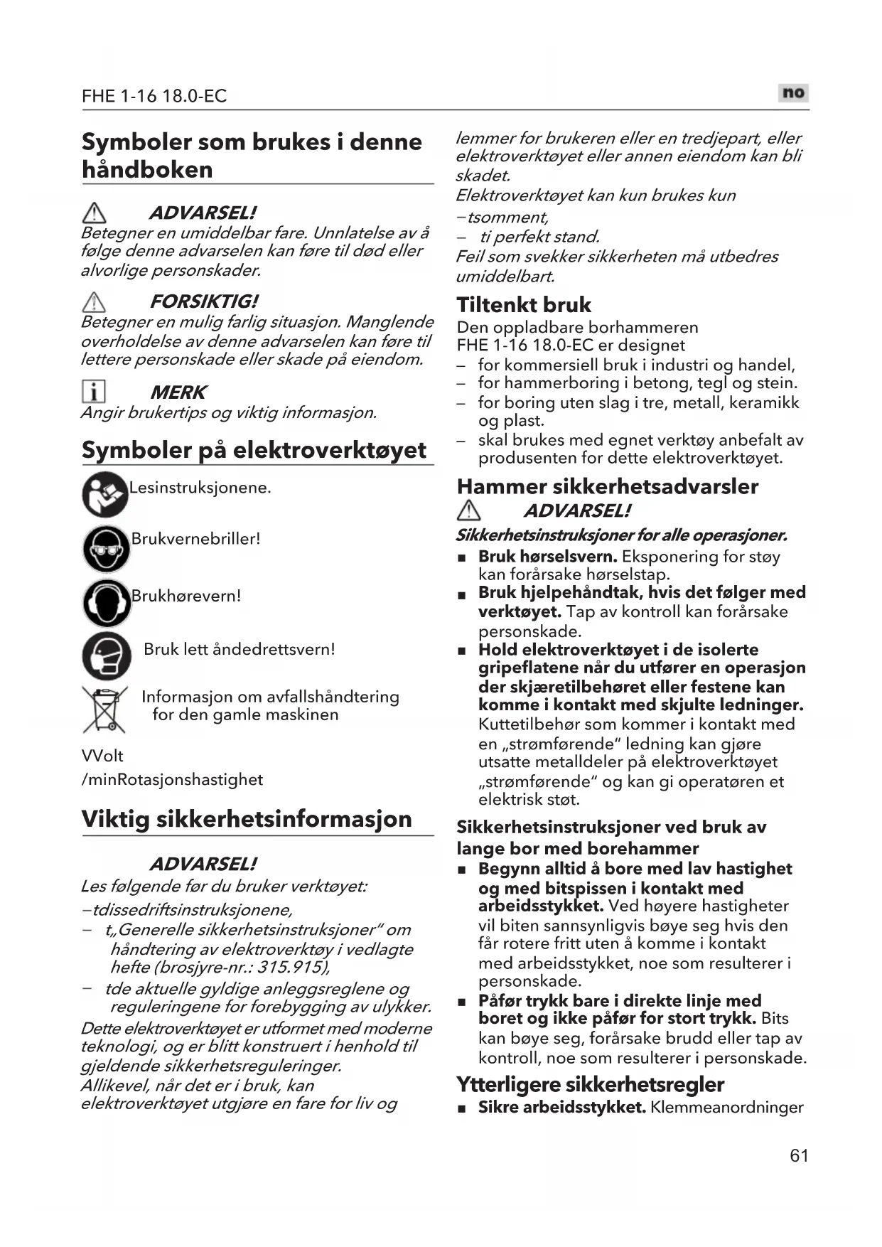 Symboler som brukes i denne håndboken ADVARSEL! Betegner en umiddelbar fare. Unnlatelse av å følge denne advarselen kan føre til død eller alvorlige personskader. FORSIKTIG! Betegner en mulig farlig situasjon. Manglende overholdelse av denne advarselen kan føre til lettere personskade eller skade på eiendom. MERK Angir brukertips og viktig informasjon. Symboler på elektroverktøyet Les instruksjonene. Bruk vernebriller! Bruk hørevern! Bruk lett åndedrettsvern! Informasjon om avfallshåndtering for den gamle maskinen V Volt /min Rotasjonshastighet Viktig sikkerhetsinformasjon ADVARSEL! Les følgende før du bruker verktøyet: tdisse driftsinstruksjonene, t„Generelle sikkerhetsinstruksjoner“ om håndtering av elektroverktøy i vedlagte hefte (brosjyre-nr.: 315.915), tde aktuelle gyldige anleggsreglene og reguleringene for forebygging av ulykker. Dette elektroverktøyet er utformet med mo derne teknologi, og er blitt konstruert i henhold til gjeldende sikkerhetsreguleringer. Allikevel, når det er i bruk, kan elektroverktøyet utgjøre en fare for liv og lemmer for brukeren eller en tredjepart, eller elektroverktøyet eller annen eiendom kan bli skadet. Elektroverktøyet kan kun brukes kun tsom ment, ti perfekt stand. Feil som svekker sikkerheten må utbedres umiddelbart. Tiltenkt bruk Den oppladbare borhammeren FHE 1-16 18.0-EC er designet