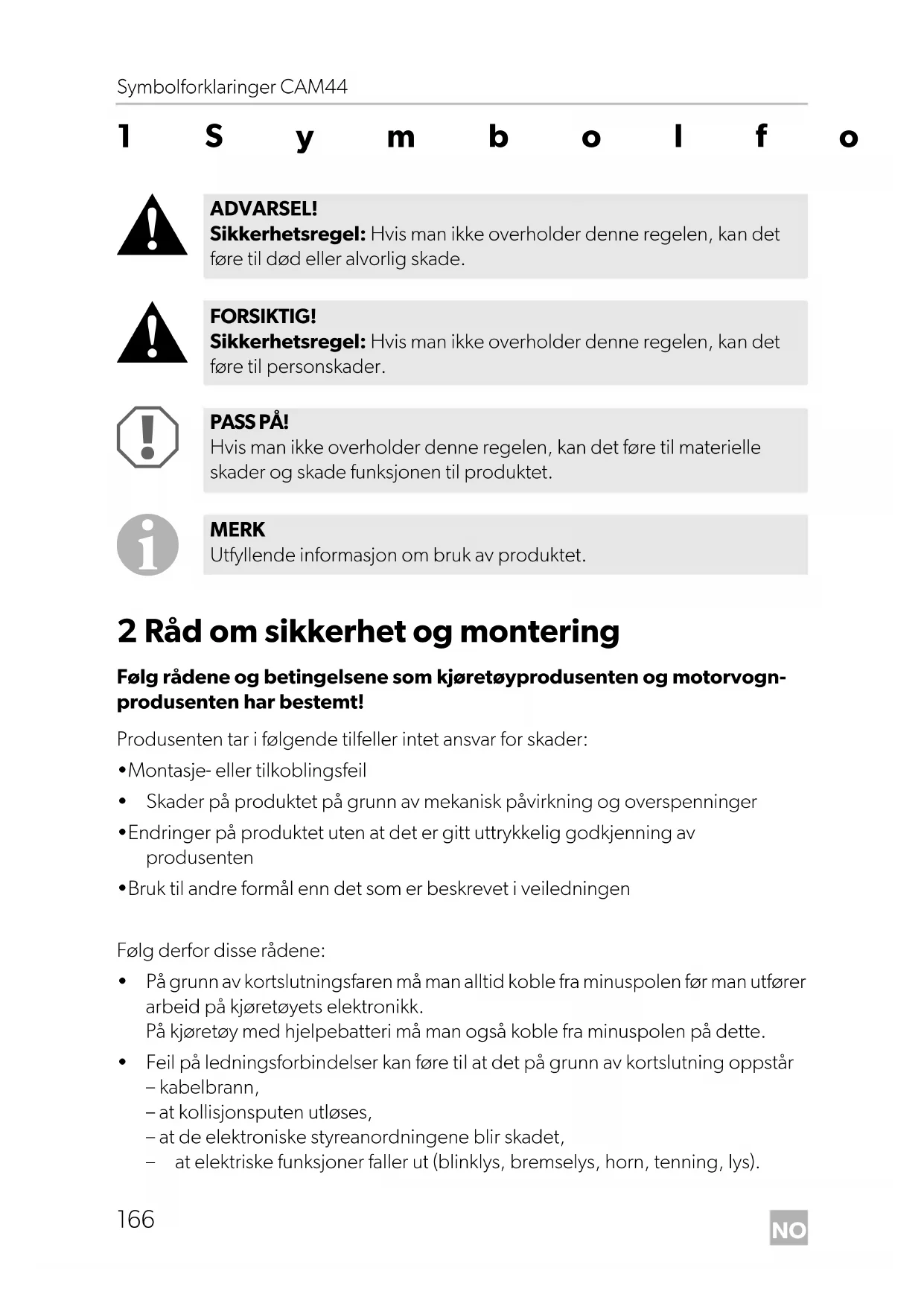 2 Råd om sikkerhet og montering Følg rådene og betingelsene som kjøretøyprodusenten og motorvogn- produsenten har bestemt! Produsenten tar i følgende tilfeller intet ansvar for skader: