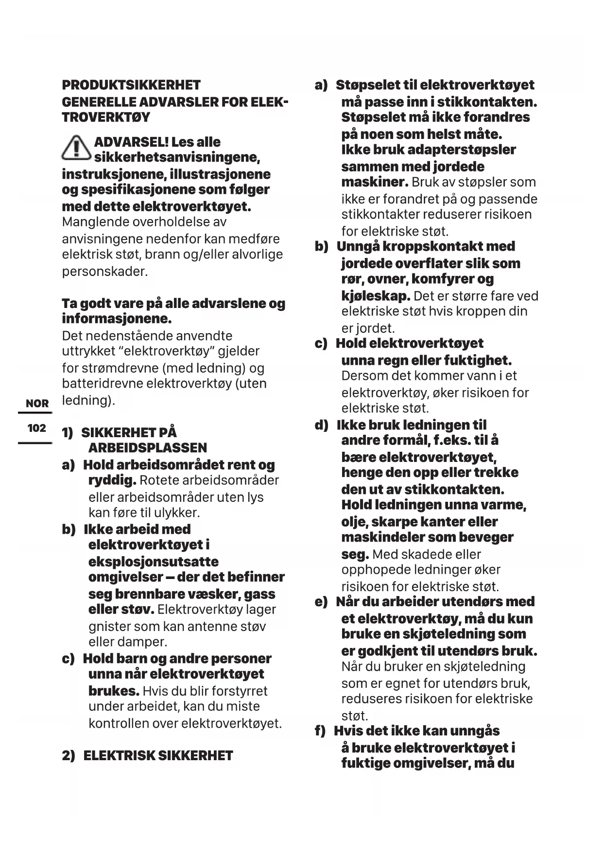 ARBEIDSPLASSEN a) Hold arbeidsområdet rent og ryddig. Rotete arbeidsområder eller arbeidsområder uten lys kan føre til ulykker. b) Ikke arbeid med elektroverktøyet i eksplosjonsutsatte omgivelser – der det befinner seg brennbare væsker, gass eller støv. Elektroverktøy lager gnister som kan antenne støv eller damper. c) Hold barn og andre personer unna når elektroverktøyet brukes. Hvis du blir forstyrret under arbeidet, kan du miste kontrollen over elektroverktøyet.