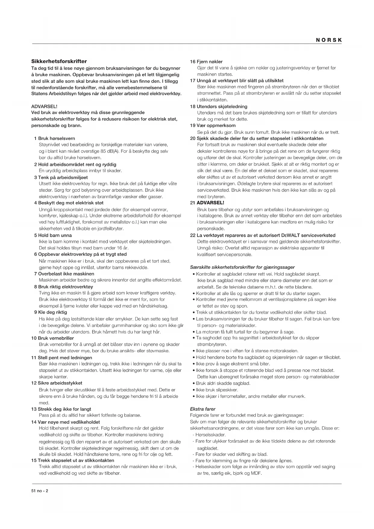 TÜV Rheinland Sicherheit und Umweltschutz GmbH Am Grauen Stein D-51105 Köln Germany Sert. Nr.AM 9511299 01 Director Engineering and Product Development Horst Großmann DEWALT, Richard-Klinger-Straße 40, D-65510, Idstein, TysklandNORSK 51 no - 2 Sikkerhetsforskrifter Ta deg tid til å lese nøye gjennom bruksanvisningen før du begynner å bruke maskinen. Oppbevar bruksanvisningen på et lett tilgjengelig sted slik at alle som skal bruke maskinen lett kan finne den. I tillegg til nedenforstående forskrifter, må alle vernebestemmelsene til Statens Arbeidstilsyn følges når det gjelder arbeid med elektroverktøy. ADVARSEL! Ved bruk av elektroverktøy må disse grunnleggende sikkerhetsforskrifter følges for å redusere risikoen for elektrisk støt, personskade og brann. 1 Bruk hørselsvern Støynivået ved bearbeiding av forskjellige materialer kan variere, og i blant kan nivået overstige 85 dB(A). For å beskytte deg selv bør du alltid bruke hørselsvern. 2 Hold arbeidsområdet rent og ryddig En uryddig arbeidsplass innbyr til skader. 3 Tenk på arbeidsmiljøet Utsett ikke elektroverktøy for regn. Ikke bruk det på fuktige eller våte steder. Sørg for god belysning over arbeidsplassen. Bruk ikke elektroverktøy i nærheten av brannfarlige væsker eller gasser. 4 Beskytt deg mot elektrisk støt Unngå kroppskontakt med jordede deler (for eksempel vannrør, komfyrer, kjøleskap o.l.). Under ekstreme arbeidsforhold (for eksempel ved høy luftfuktighet, forekomst av metallstøv o.l.) kan man øke sikkerheten ved å tilkoble en jordfeilbryter. 5 Hold barn unna Ikke la barn komme i kontakt med verktøyet eller skjøteledningen. Det skal holdes tilsyn med barn under 16 år. 6 Oppbevar elektroverktøy på et trygt sted Når maskinen ikke er i bruk, skal den oppbevares på et tørt sted, gjerne høyt oppe og innlåst, utenfor barns rekkevidde. 7 Overbelast ikke maskinen Maskinen arbeider bedre og sikrere innenfor det angitte effektområdet. 8 Bruk riktig elektroverktøy Tving ikke en maskin til å gjøre arbeid som krever kraftigere verktøy. Bruk ikke elektroverktøy til formål det ikke er ment for, som for eksempel å fjerne kvister eller kappe ved med en håndsirkelsag. 9 Kle deg riktig Ha ikke på deg løstsittende klær eller smykker. De kan sette seg fast i de bevegelige delene. Vi anbefaler gummihansker og sko som ikke glir når du arbeider utendørs. Bruk hårnett hvis du har langt hår. 10 Bruk vernebriller Bruk vernebriller for å unngå at det blåser støv inn i øynene og skader deg. Hvis det støver mye, bør du bruke ansikts- eller støvmaske. 11 Stell pent med ledningen Bær ikke maskinen i ledningen og, trekk ikke i ledningen når du skal ta støpselet ut av stikkontakten. Utsett ikke ledningen for varme, olje eller skarpe kanter. 12 Sikre arbeidsstykket Bruk tvinger eller skrustikker til å feste arbeidsstykket med. Dette er sikrere enn å bruke hånden, og du får begge hendene fri til å arbeide med. 13 Strekk deg ikke for langt Pass på at du alltid har sikkert fotfeste og balanse. 14 Vær nøye med vedlikeholdet Hold tilbehøret skarpt og rent. Følg forskriftene når det gjelder vedlikehold og skifte av tilbehør. Kontroller maskinens ledning regelmessig og få den reparert av et autorisert verksted om den skulle bli skadet. Kontroller skjøteledninger regelmessig, skift dem ut om de skulle bli skadet. Hold håndtakene tørre, rene og fri for olje og fett. 15 Trekk støpselet ut av stikkontakten Trekk alltid støpselet ut av stikkontakten når maskinen ikke er i bruk, ved vedlikehold og ved skifte av tilbehør. 16 Fjern nøkler Gjør det til vane å sjekke om nøkler og justeringsverktøy er fjernet før maskinen startes. 17 Unngå at verktøyet blir slått på utilsiktet Bær ikke maskinen med fingeren på strømbryteren når den er tilkoblet strømnettet. Pass på at strømbryteren er avslått når du setter støpselet i stikkontakten. 18 Utendørs skjøteledning Utendørs må det bare brukes skjøteledning som er tillatt for utendørs bruk og merket for dette. 19 Vær oppmerksom Se på det du gjør. Bruk sunn fornuft. Bruk ikke maskinen når du er trett. 20 Sjekk skadede deler før du setter støpselet i stikkontakten Før fortsatt bruk av maskinen skal eventuelle skadede deler eller deksler kontrolleres nøye for å bringe på det rene om de fungerer riktig og utfører det de skal. Kontroller justeringen av bevegelige deler, om de sitter i klemme, om deler er brukket. Sjekk at alt er riktig montert og er slik det skal være. En del eller et deksel som er skadet, skal repareres eller skiftes ut av et autorisert verksted dersom ikke annet er angitt i bruksanvisningen. Ødelagte brytere skal repareres av et autorisert serviceverksted. Bruk ikke maskinen hvis den ikke kan slås av og på med bryteren. 21 ADVARSEL! Bruk bare tilbehør og utstyr som anbefales i bruksanvisningen og i katalogene. Bruk av annet verktøy eller tilbehør enn det som anbefales i bruksanvisningen eller i katalogene kan medføre en mulig risiko for personskade. 22 La verktøyet repareres av et autorisert DEWALT serviceverksted Dette elektroverktøyet er i samsvar med gjeldende sikkerhetsforskrifter. Unngå risiko: Overlat alltid reparasjon av elektriske apparater til kvalifisert servicepersonale. Særskilte sikkerhetsforskrifter for gjæringssager