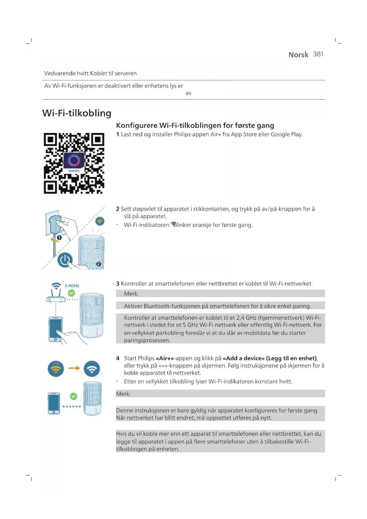 Wi-Fi-indikatoren blinker oransje for første gang. 2.4GHz 3 Kontroller at smarttelefonen eller nettbrettet er koblet til Wi-Fi-nettverket. Merk: Aktiver Bluetooth-funksjonen på smarttelefonen for å sikre enkel paring. Kontroller at smarttelefonen er koblet til et 2,4GHz (hjemmenettverk) Wi-Fi- nettverk i stedet for et 5GHz Wi-Fi-nettverk eller offentlig Wi-Fi-nettverk. For en vellykket parkobling foreslår vi at du slår av mobildata før du starter paringsprosessen. 4 Start Philips «Air+»-appen og klikk på «Add a device» (Legg til en enhet), eller trykk på «+»-knappen på skjermen. Følg instruksjonene på skjermen for å koble apparatet til nettverket.