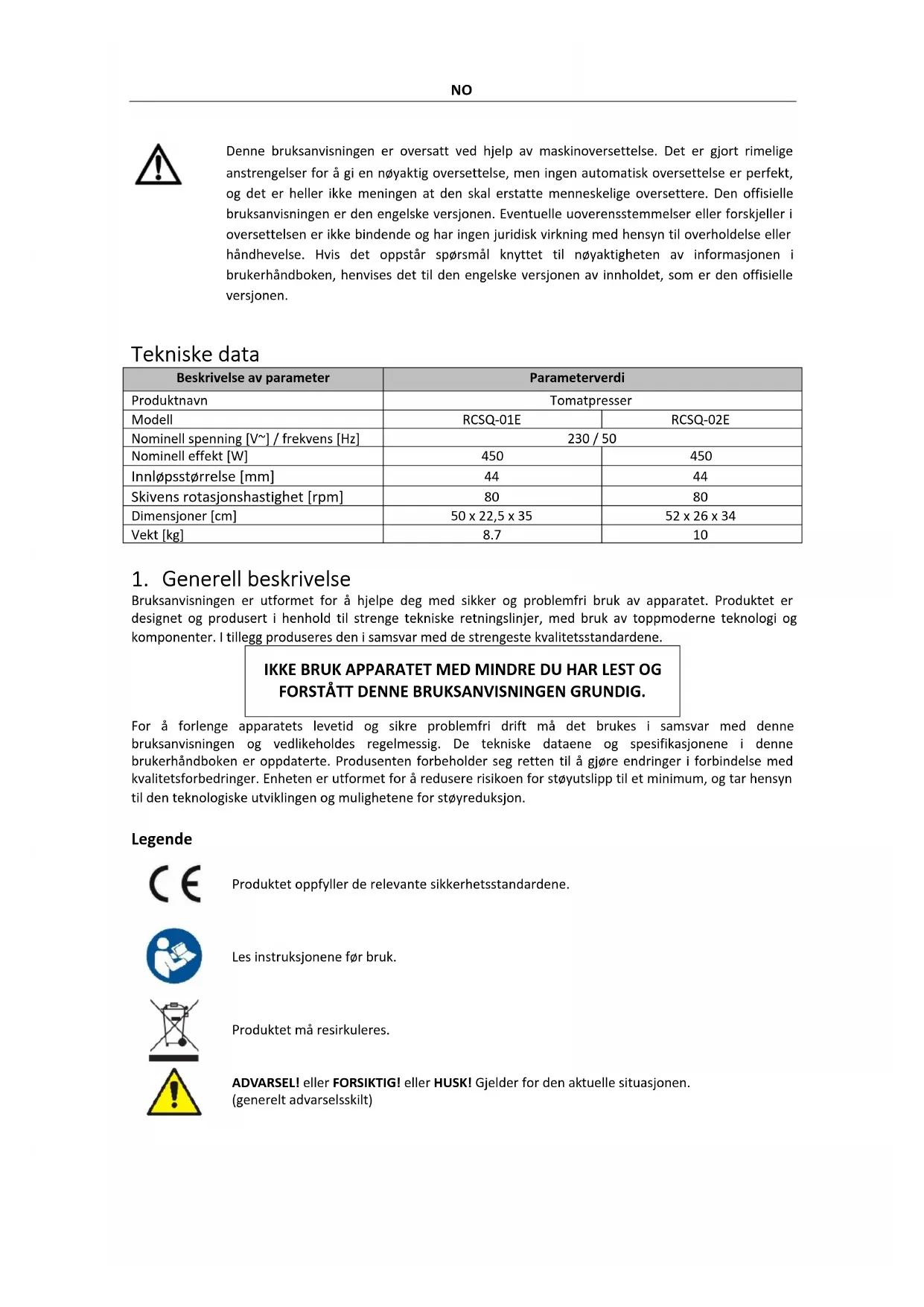 Bruksanvisningen er utformet for å hjelpe deg med sikker og problemfri bruk av apparatet. Produktet er designet og produsert i henhold til strenge tekniske retningslinjer, med bruk av toppmoderne teknologi og komponenter. I tillegg produseres den i samsvar med de strengeste kvalitetsstandardene. IKKE BRUK APPARATET MED MINDRE DU HAR LEST OG FORSTÅTT DENNE BRUKSANVISNINGEN GRUNDIG. For å forlenge apparatets levetid og sikre problemfri drift må det brukes i samsvar med denne bruksanvisningen og vedlikeholdes regelmessig. De tekniske dataene og spesifikasjonene i denne brukerhåndboken er oppdaterte. Produsenten forbeholder seg retten til å gjøre endringer i forbindelse med kvalitetsforbedringer. Enheten er utformet for å redusere risikoen for støyutslipp til et minimum, og tar hensyn til den teknologiske utviklingen og mulighetene for støyreduksjon. Legende Produktet oppfyller de relevante sikkerhetsstandardene. Les instruksjonene før bruk.