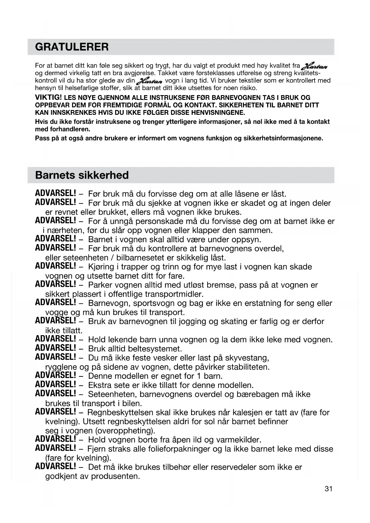 11GRATULERER For at barnet ditt kan føle seg sikkert og trygt, har du valgt et produkt med høy kvalitet fra og dermed virkelig tatt en bra avgjørelse. Takket være førsteklasses utførelse og streng kvalitets- kontroll vil du ha stor glede av din vogn i lang tid. Vi bruker tekstiler som er kontrollert med hensyn til helsefarlige stoffer, slik at barnet ditt ikke utsettes for noen risiko. VIKTIG! LES NØYE GJENNOM ALLE INSTRUKSENE FØR BARNEVOGNEN TAS I BRUK OG OPPBEVAR DEM FOR FREMTIDIGE FORMÅL OG KONTAKT. SIKKERHETEN TIL BARNET DITT KAN INNSKRENKES HVIS DU IKKE FØLGER DISSE HENVISNINGENE. Hvis du ikke forstår instruksene og trenger ytterligere informasjoner, så nøl ikke med å ta kontakt med forhandleren. Pass på at også andre brukere er informert om vognens funksjon og sikkerhetsinformasjonene. ADVARSEL! – Før bruk må du forvisse deg om at alle låsene er låst. ADVARSEL! – Før bruk må du sjekke at vognen ikke er skadet og at ingen deler er revnet eller brukket, ellers må vognen ikke brukes. ADVARSEL! – For å unngå personskade må du forvisse deg om at barnet ikke er i nærheten, før du slår opp vognen eller klapper den sammen. ADVARSEL! – Barnet i vognen skal alltid være under oppsyn. ADVARSEL! – Før bruk må du kontrollere at barnevognens overdel, eller seteenheten / bilbarnesetet er skikkelig låst. ADVARSEL! – Kjøring i trapper og trinn og for mye last i vognen kan skade vognen og utsette barnet ditt for fare. ADVARSEL! – Parker vognen alltid med utløst bremse, pass på at vognen er sikkert plassert i offentlige transportmidler. ADVARSEL! – Barnevogn, sportsvogn og bag er ikke en erstatning for seng eller vogge og må kun brukes til transport. ADVARSEL! – Bruk av barnevognen til jogging og skating er farlig og er derfor ikke tillatt. ADVARSEL! – Hold lekende barn unna vognen og la dem ikke leke med vognen. ADVARSEL! – Bruk alltid beltesystemet. ADVARSEL! – Du må ikke feste vesker eller last på skyvestang, rygglene og på sidene av vognen, dette påvirker stabiliteten. ADVARSEL! – Denne modellen er egnet for 1 barn. ADVARSEL! – Ekstra sete er ikke tillatt for denne modellen. ADVARSEL! – Seteenheten, barnevognens overdel og bærebagen må ikke brukes til transport i bilen. ADVARSEL! – Regnbeskyttelsen skal ikke brukes når kalesjen er tatt av (fare for kvelning). Utsett regnbeskyttelsen aldri for sol når barnet befinner seg i vognen (overoppheting). ADVARSEL! – Hold vognen borte fra åpen ild og varmekilder. ADVARSEL! – Fjern straks alle folieforpakninger og la ikke barnet leke med disse (fare for kvelning). ADVARSEL! – Det må ikke brukes tilbehør eller reservedeler som ikke er godkjent av produsenten. Barnets sikkerhed