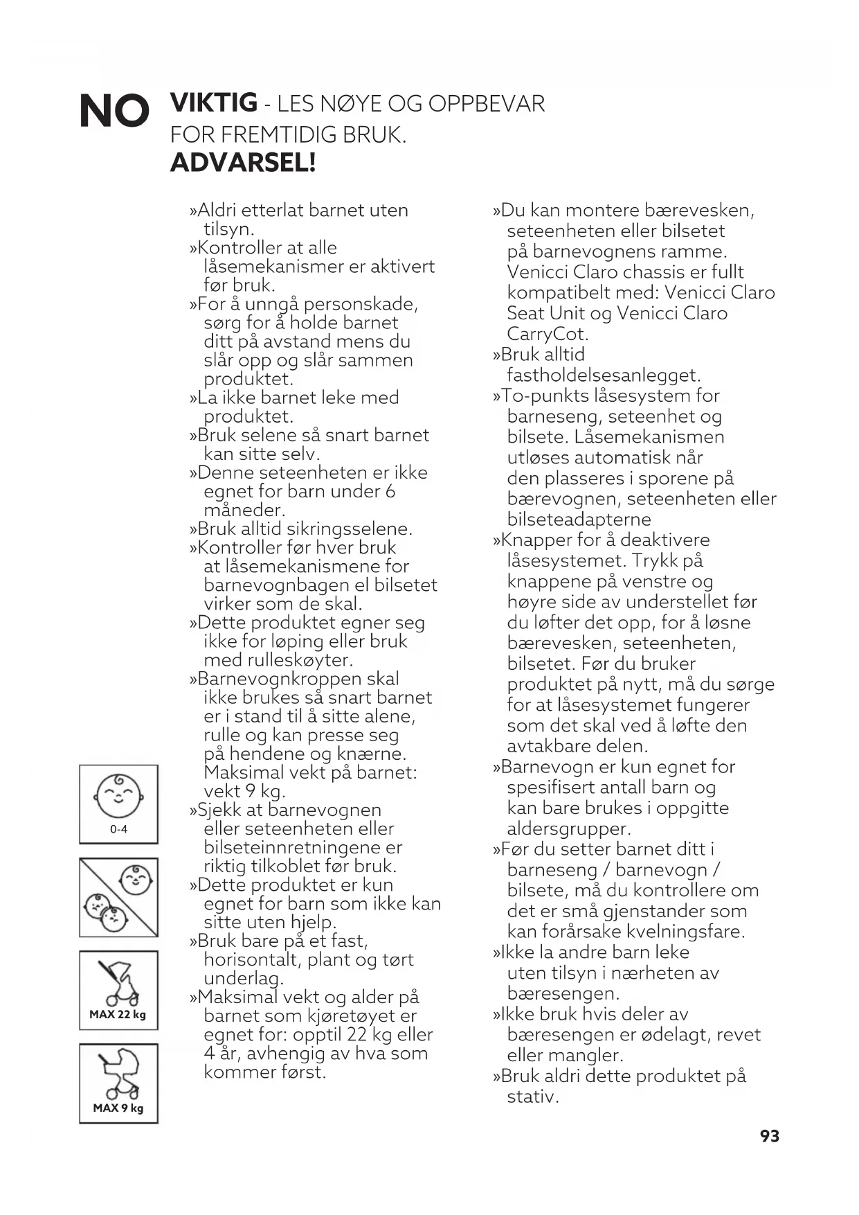 VIKTIG - LES NØYE OG OPPBEVAR FOR FREMTIDIG BRUK. ADVARSEL! » Aldri etterlat barnet uten tilsyn. » Kontroller at alle låsemekanismer er aktivert før bruk. » For å unngå personskade, sørg for å holde barnet ditt på avstand mens du slår opp og slår sammen produktet. » La ikke barnet leke med produktet. » Bruk selene så snart barnet kan sitte selv. » Denne seteenheten er ikke egnet for barn under 6 måneder. » Bruk alltid sikringsselene. » Kontroller før hver bruk at låsemekanismene for barnevognbagen el bilsetet virker som de skal. » Dette produktet egner seg ikke for løping eller bruk med rulleskøyter. » Barnevognkroppen skal ikke brukes så snart barnet er i stand til å sitte alene, rulle og kan presse seg på hendene og knærne. Maksimal vekt på barnet: vekt 9 kg. » Sjekk at barnevognen eller seteenheten eller bilseteinnretningene er riktig tilkoblet før bruk. » Dette produktet er kun egnet for barn som ikke kan sitte uten hjelp. » Bruk bare på et fast, horisontalt, plant og tørt underlag. » Maksimal vekt og alder på barnet som kjøretøyet er egnet for: opptil 22 kg eller 4 år, avhengig av hva som kommer først. » Du kan montere bærevesken, seteenheten eller bilsetet på barnevognens ramme. Venicci Claro chassis er fullt kompatibelt med: Venicci Claro Seat Unit og Venicci Claro CarryCot. » Bruk alltid fastholdelsesanlegget. » To-punkts låsesystem for barneseng, seteenhet og bilsete. Låsemekanismen utløses automatisk når den plasseres i sporene på bærevognen, seteenheten eller bilseteadapterne » Knapper for å deaktivere låsesystemet. Trykk på knappene på venstre og høyre side av understellet før du løfter det opp, for å løsne bærevesken, seteenheten, bilsetet. Før du bruker produktet på nytt, må du sørge for at låsesystemet fungerer som det skal ved å løfte den avtakbare delen. » Barnevogn er kun egnet for spesifisert antall barn og kan bare brukes i oppgitte aldersgrupper. » Før du setter barnet ditt i barneseng / barnevogn / bilsete, må du kontrollere om det er små gjenstander som kan forårsake kvelningsfare. » Ikke la andre barn leke uten tilsyn i nærheten av bæresengen. » Ikke bruk hvis deler av bæresengen er ødelagt, revet eller mangler. » Bruk aldri dette produktet på stativ.94