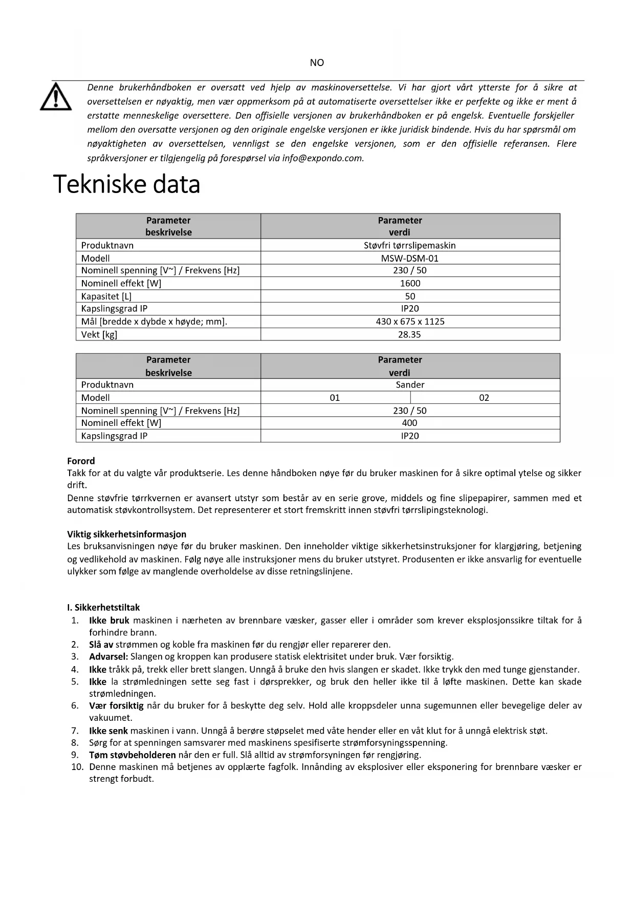 Denne brukerhåndboken er oversatt ved hjelp av maskinoversettelse. Vi har gjort vårt ytterste for å sikre at oversettelsen er nøyaktig, men vær oppmerksom på at automatiserte oversettelser ikke er perfekte og ikke er ment å erstatte menneskelige oversettere. Den offisielle versjonen av brukerhåndboken er på engelsk. Eventuelle forskjeller mellom den oversatte versjonen og den originale engelske versjonen er ikke juridisk bindende. Hvis du har spørsmål om nøyaktigheten av oversettelsen, vennligst se den engelske versjonen, som er den offisielle referansen. Flere språkversjoner er tilgjengelig på forespørsel via info@expondo.com. Tekniske data Parameter beskrivelse Parameter verdi Produktnavn Støvfri tørrslipemaskin Modell MSW-DSM-01 Nominell spenning [V~] / Frekvens [Hz] 230 / 50 Nominell effekt [W]