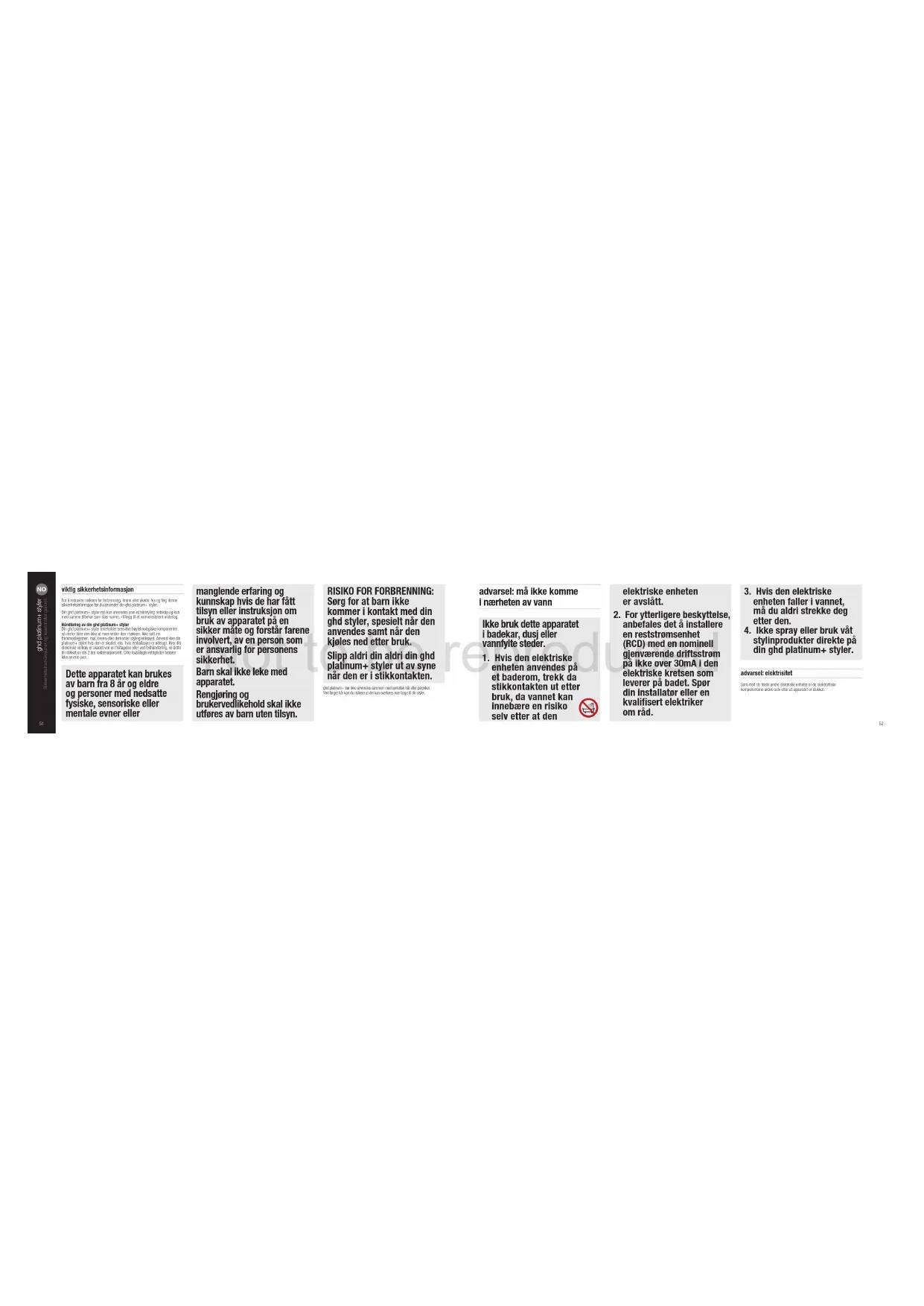 viktig sikkerhetsinformasjon For å redusere risikoen for forbrenning, brann eller skade, les og følg denne sikkerhetsinformajon før du anvender din ghd platinum+ styler. Din ghd platinum+ styler må kun anvendes som et hårstyling redskap og kun med samme tilbehør som tåler varme, i tillegg til et varmeresistent underlagHåndtering av din ghd platinum+ styler Din ghd platinum+ styler inneholder sensitive høyteknologiske komponenter, så derfor tåler den ikke at man mister den i bakken. Ikke sett inn fremmedlegemer, mal, brenn eller demonter stylingverktøyet. Anvend ikke din platinum+ styler hvis den er skadet, eks. hvis emballasjen er ødelagt. Hvis ditt elektriske verktøy er skadet ved en feiltagelse eller ved feilhåndtering, vil dette bli dekket av din 2 års reklamasjonsrett. Dine lovpålagte rettigheter berører ikke nevnte over. Dette apparatet kan brukes av barn fra 8 år og eldre og personer med nedsatte fysiske, sensoriske eller mentale evner eller manglende erfaring og kunnskap hvis de har fått tilsyn eller instruksjon om bruk av apparatet på en sikker måte og forstår farene involvert, av en person som er ansvarlig for personens sikkerhet. Barn skal ikke leke med apparatet. Rengjøring og brukervedlikehold skal ikke utføres av barn uten tilsyn. RISIKO FOR FORBRENNING: Sørg for at barn ikke kommer i kontakt med din ghd styler, spesielt når den anvendes samt når den kjøles ned etter bruk. Slipp aldri din aldri din ghd platinum+ styler ut av syne når den er i stikkontakten. ghd platinum+ bør ikke anvendes sammen med syntetisk hår eller parykker. Ved farget hår kan du risikere at det kan overføres noe farge til din styler. advarsel: må ikke komme i nærheten av vann Ikke bruk dette apparatet i badekar, dusj eller vannfylte steder.