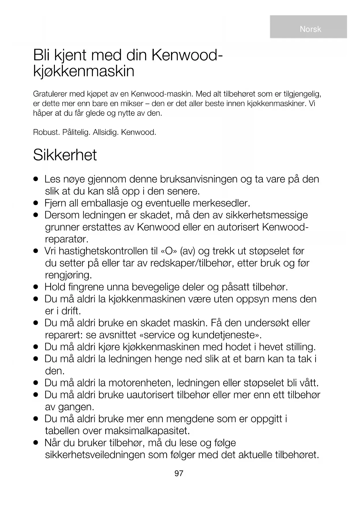 Bruk bare apparatet til dets tiltenkte hjemlige bruk. Kenwood frasier seg ethvert ansvar ved feilaktig bruk eller dersom apparatet ikke er brukt i henhold til denne bruksanvisningen. Før du setter inn støpselet