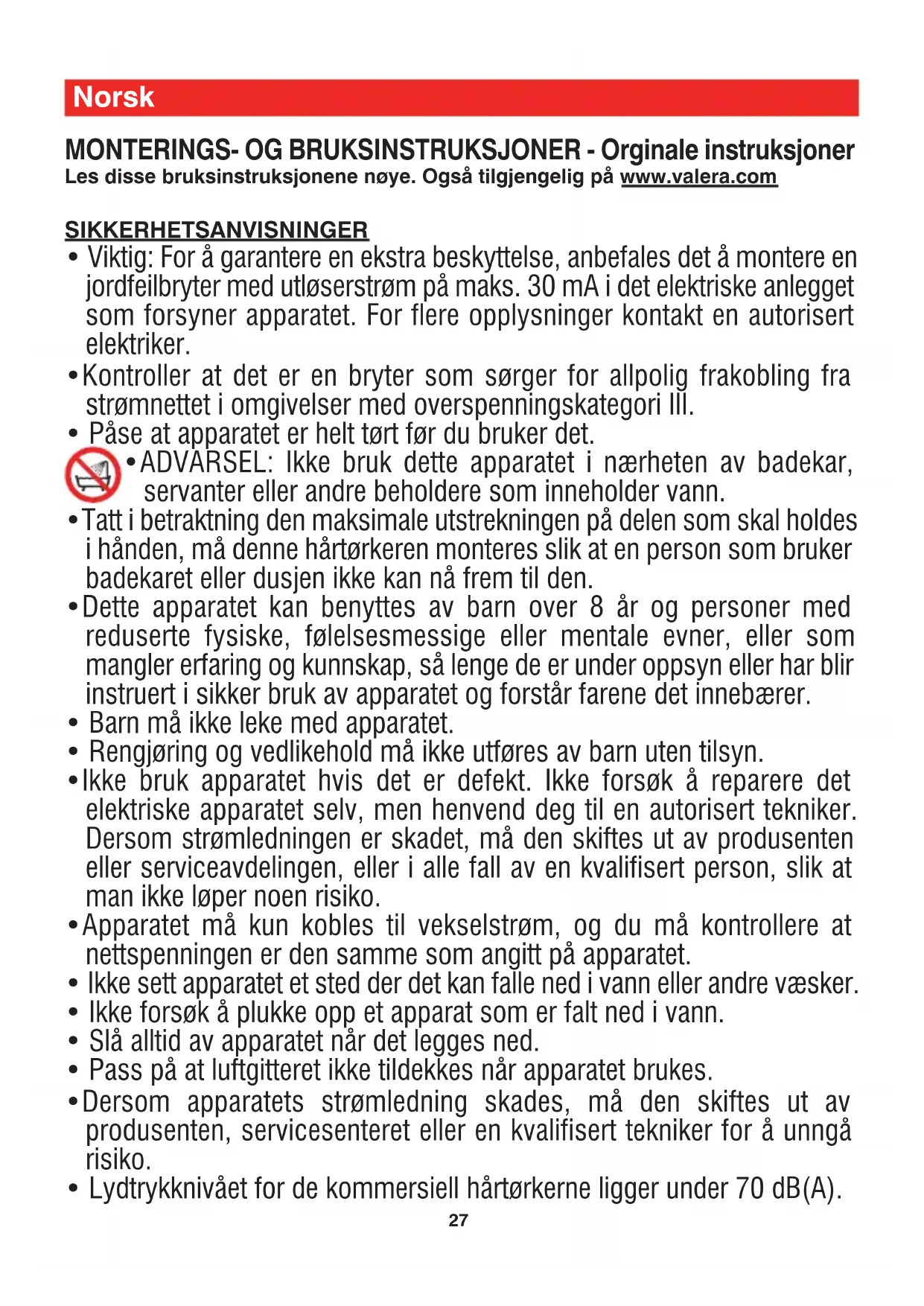 - ADVARSEL: Ikke bruk dette apparatet i nærheten av badekar, servanter eller andre beholdere som inneholder vann.