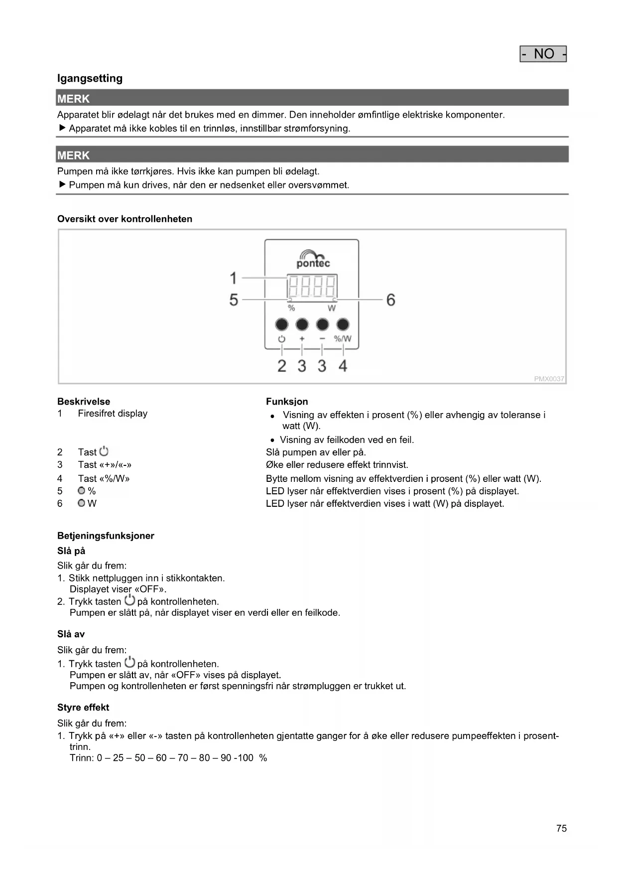 Igangsetting MERK Apparatet blir ødelagt når det brukes med en dimmer. Den inneholder ømfintlige elektriske komponenter. Apparatet må ikke kobles til en trinnløs, innstillbar strømforsyning. MERK Pumpen må ikke tørrkjøres. Hvis ikke kan pumpen bli ødelagt. Pumpen må kun drives, når den er nedsenket eller oversvømmet.