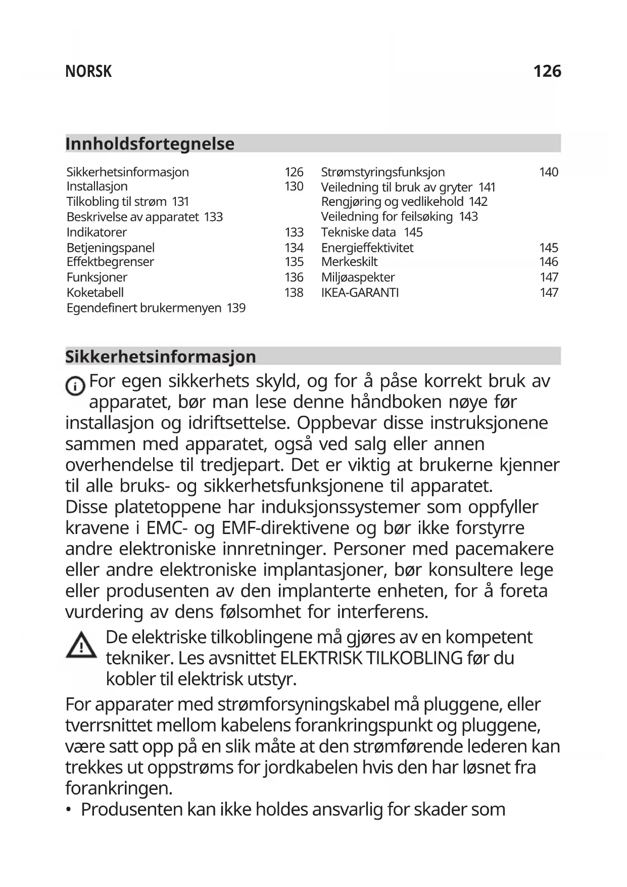 - Produsenten kan ikke holdes ansvarlig for skader som Sikkerhetsinformasjon 126 Installasjon 130 Tilkobling til strøm 131 Beskrivelse av apparatet 133 Indikatorer 133 Betjeningspanel 134 Effektbegrenser 135 Funksjoner 136 Koketabell 138 Egendefinert brukermenyen 139 Strømstyringsfunksjon 140 Veiledning til bruk av gryter 141 Rengjøring og vedlikehold 142 Veiledning for feilsøking 143 Tekniske data 145 Energieffektivitet 145 Merkeskilt 146 Miljøaspekter 147 IKEA-GARANTI 147127 NORSK skyldes feilaktig installasjon eller bruk.