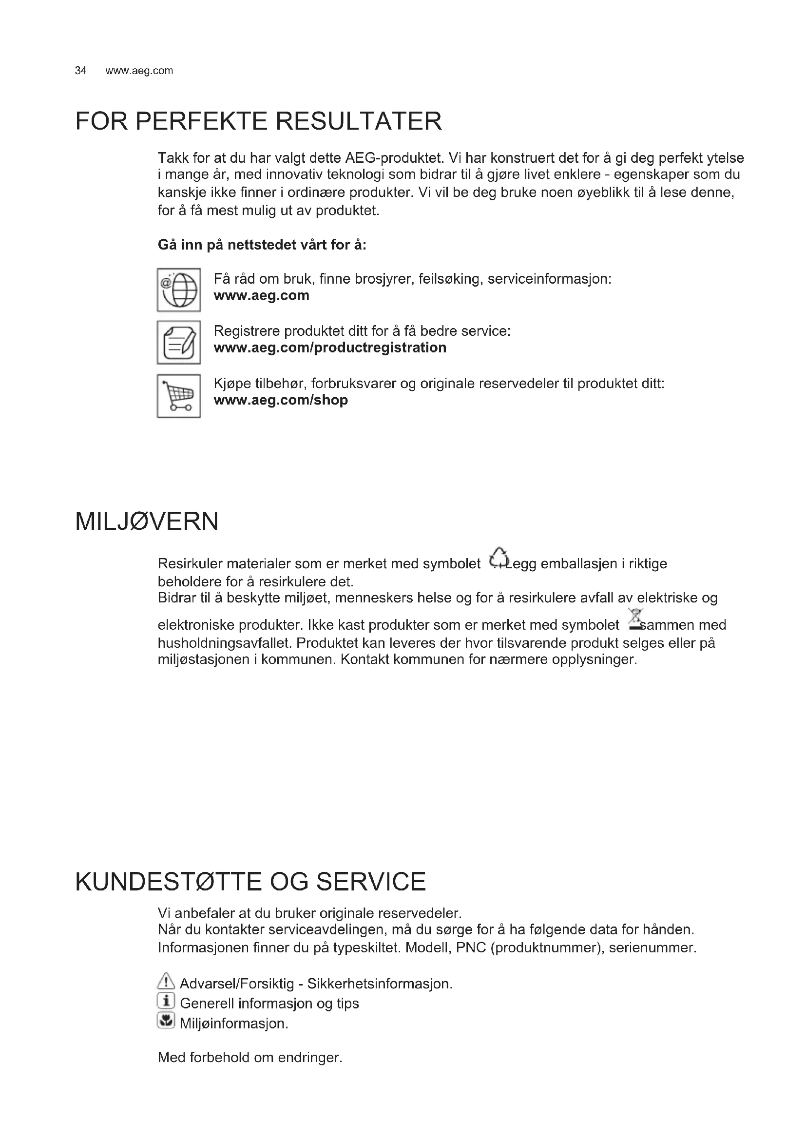 Takk for at du har valgt dette AEG-produktet. Vi har konstruert det for å gi deg perfekt ytelse i mange år, med innovativ teknologi som bidrar til å gjøre livet enklere - egenskaper som du kanskje ikke finner i ordinære produkter. Vi vil be deg bruke noen øyeblikk til å lese denne, for å få mest mulig ut av produktet. Gå inn på nettstedet vårt for å: Få råd om bruk, finne brosjyrer, feilsøking, serviceinformasjon: www.aeg.com Registrere produktet ditt for å få bedre service: www.aeg.com/productregistration Kjøpe tilbehør, forbruksvarer og originale reservedeler til produktet ditt: www.aeg.com/shop MILJØVERN Resirkuler materialer som er merket med symbolet . Legg emballasjen i riktige beholdere for å resirkulere det. Bidrar til å beskytte miljøet, menneskers helse og for å resirkulere avfall av elektriske og elektroniske produkter. Ikke kast produkter som er merket med symbolet sammen med husholdningsavfallet. Produktet kan leveres der hvor tilsvarende produkt selges eller på miljøstasjonen i kommunen. Kontakt kommunen for nærmere opplysninger.