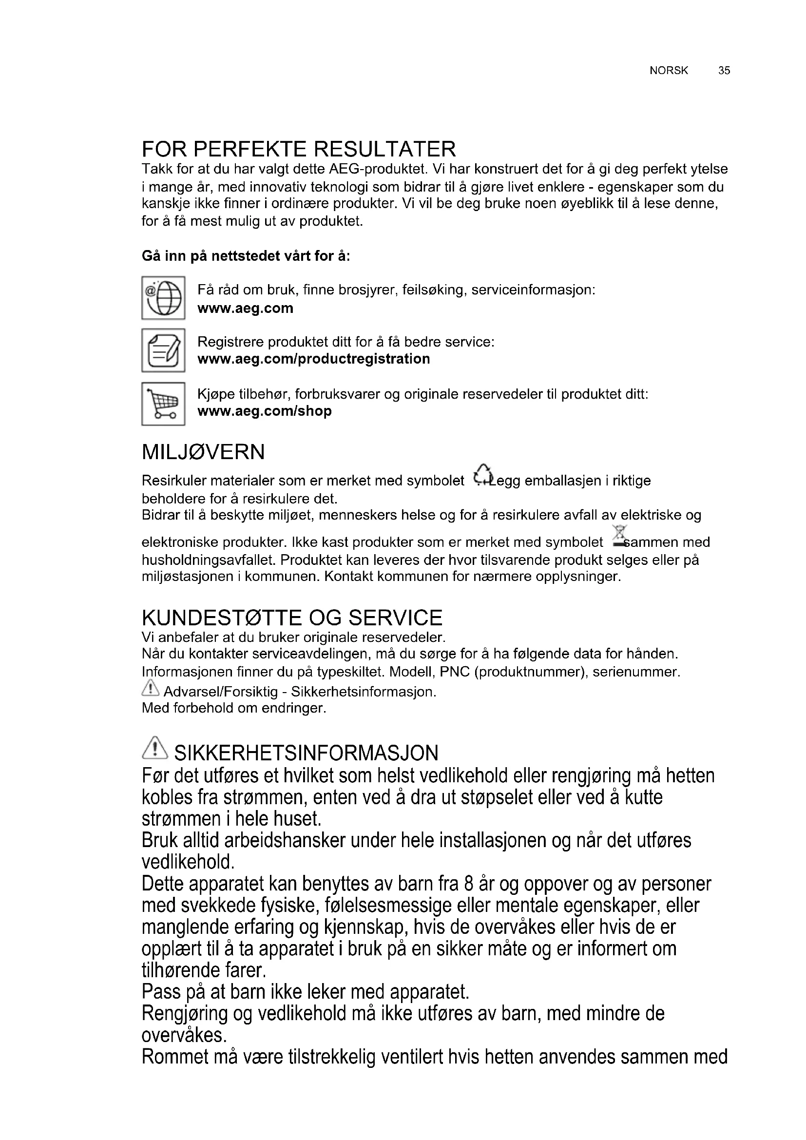 Vi anbefaler at du bruker originale reservedeler. Når du kontakter serviceavdelingen, må du sørge for å ha følgende data for hånden. Informasjonen nner du på typeskiltet. Modell, PNC (produktnummer), serienummer. Advarsel/Forsiktig - Sikkerhetsinformasjon. Med forbehold om endringer. SIKKERHETSINFORMASJON Før det utføres et hvilket som helst vedlikehold eller rengjøring må hetten kobles fra strømmen, enten ved å dra ut støpselet eller ved å kutte strømmen i hele huset. Bruk alltid arbeidshansker under hele installasjonen og når det utføres vedlikehold. Dette apparatet kan benyttes av barn fra 8 år og oppover og av personer med svekkede fysiske, følelsesmessige eller mentale egenskaper, eller manglende erfaring og kjennskap, hvis de overvåkes eller hvis de er opplært til å ta apparatet i bruk på en sikker måte og er informert om tilhørende farer. Pass på at barn ikke leker med apparatet. Rengjøring og vedlikehold må ikke utføres av barn, med mindre de overvåkes. Rommet må være tilstrekkelig ventilert hvis hetten anvendes sammen med NO BRUKSVEILEDNINGwww.aeg.com