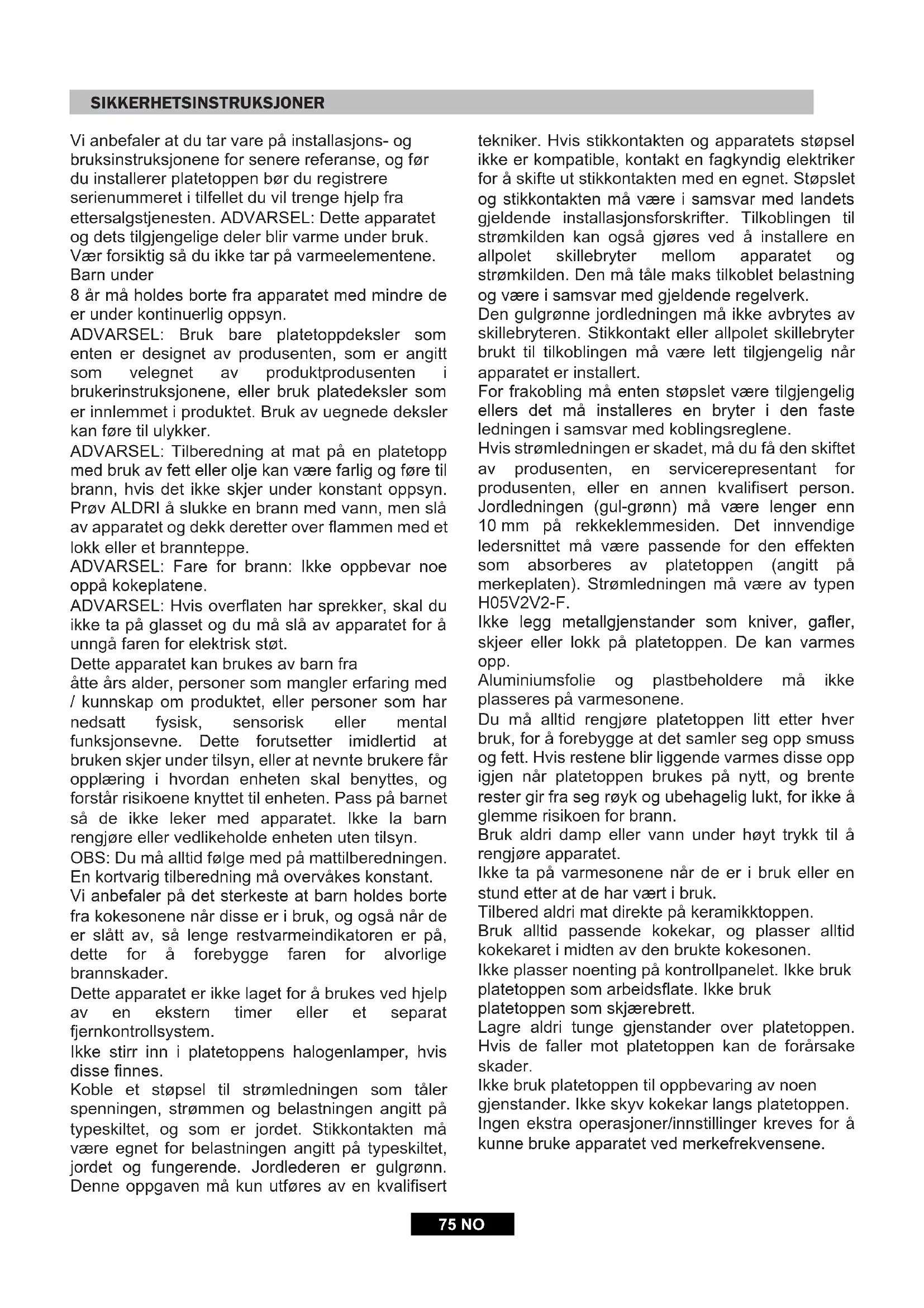 Vi anbefaler at du tar vare på installasjons- og bruksinstruksjonene for senere referanse, og før du installerer platetoppen bør du registrere serienummeret i tilfellet du vil trenge hjelp fra ettersalgstjenesten. ADVARSEL: Dette apparatet og dets tilgjengelige deler blir varme under bruk. Vær forsiktig så du ikke tar på varmeelementene. Barn under 8 år må holdes borte fra apparatet med mindre de er under kontinuerlig oppsyn. ADVARSEL: Bruk bare platetoppdeksler som enten er designet av produsenten, som er angitt som velegnet av produktprodusenten i brukerinstruksjonene, eller bruk platedeksler som er innlemmet i produktet. Bruk av uegnede deksler kan føre til ulykker. ADVARSEL: Tilberedning at mat på en platetopp med bruk av fett eller olje kan være farlig og føre til brann, hvis det ikke skjer under konstant oppsyn. Prøv ALDRI å slukke en brann med vann, men slå av apparatet og dekk deretter over flammen med et lokk eller et brannteppe. ADVARSEL: Fare for brann: Ikke oppbevar noe oppå kokeplatene. ADVARSEL: Hvis overflaten har sprekker, skal du ikke ta på glasset og du må slå av apparatet for å unngå faren for elektrisk støt. Dette apparatet kan brukes av barn fra åtte års alder, personer som mangler erfaring med / kunnskap om produktet, eller personer som har nedsatt fysisk, sensorisk eller mental funksjonsevne. Dette forutsetter imidlertid at bruken skjer under tilsyn, eller at nevnte brukere får opplæring i hvordan enheten skal benyttes, og forstår risikoene knyttet til enheten. Pass på barnet så de ikke leker med apparatet. Ikke la barn rengjøre eller vedlikeholde enheten uten tilsyn. OBS: Du må alltid følge med på mattilberedningen. En kortvarig tilberedning må overvåkes konstant. Vi anbefaler på det sterkeste at barn holdes borte fra kokesonene når disse er i bruk, og også når de er slått av, så lenge restvarmeindikatoren er på, dette for å forebygge faren for alvorlige brannskader. Dette apparatet er ikke laget for å brukes ved hjelp av en ekstern timer eller et separat fjernkontrollsystem. Ikke stirr inn i platetoppens halogenlamper, hvis disse finnes. Koble et støpsel til strømledningen som tåler spenningen, strømmen og belastningen angitt på typeskiltet, og som er jordet. Stikkontakten må være egnet for belastningen angitt på typeskiltet, jordet og fungerende. Jordlederen er gulgrønn. Denne oppgaven må kun utføres av en kvalifisert tekniker. Hvis stikkontakten og apparatets støpsel ikke er kompatible, kontakt en fagkyndig elektriker for å skifte ut stikkontakten med en egnet. Støpslet og stikkontakten må være i samsvar med landets gjeldende installasjonsforskrifter. Tilkoblingen til strømkilden kan også gjøres ved å installere en allpolet skillebryter mellom apparatet og strømkilden. Den må tåle maks tilkoblet belastning og være i samsvar med gjeldende regelverk. Den gulgrønne jordledningen må ikke avbrytes av skillebryteren. Stikkontakt eller allpolet skillebryter brukt til tilkoblingen må være lett tilgjengelig når apparatet er installert. For frakobling må enten støpslet være tilgjengelig ellers det må installeres en bryter i den faste ledningen i samsvar med koblingsreglene. Hvis strømledningen er skadet, må du få den skiftet av produsenten, en servicerepresentant for produsenten, eller en annen kvalifisert person. Jordledningen (gul-grønn) må være lenger enn 10 mm på rekkeklemmesiden. Det innvendige ledersnittet må være passende for den effekten som absorberes av platetoppen (angitt på merkeplaten). Strømledningen må være av typen H05V2V2-F. Ikke legg metallgjenstander som kniver, gafler, skjeer eller lokk på platetoppen. De kan varmes opp. Aluminiumsfolie og plastbeholdere må ikke plasseres på varmesonene. Du må alltid rengjøre platetoppen litt etter hver bruk, for å forebygge at det samler seg opp smuss og fett. Hvis restene blir liggende varmes disse opp igjen når platetoppen brukes på nytt, og brente rester gir fra seg røyk og ubehagelig lukt, for ikke å glemme risikoen for brann. Bruk aldri damp eller vann under høyt trykk til å rengjøre apparatet. Ikke ta på varmesonene når de er i bruk eller en stund etter at de har vært i bruk. Tilbered aldri mat direkte på keramikktoppen. Bruk alltid passende kokekar, og plasser alltid kokekaret i midten av den brukte kokesonen. Ikke plasser noenting på kontrollpanelet. Ikke bruk platetoppen som arbeidsflate. Ikke bruk platetoppen som skjærebrett. Lagre aldri tunge gjenstander over platetoppen. Hvis de faller mot platetoppen kan de forårsake skader. Ikke bruk platetoppen til oppbevaring av noen gjenstander. Ikke skyv kokekar langs platetoppen. Ingen ekstra operasjoner/innstillinger kreves for å kunne bruke apparatet ved merkefrekvensene.76 NO