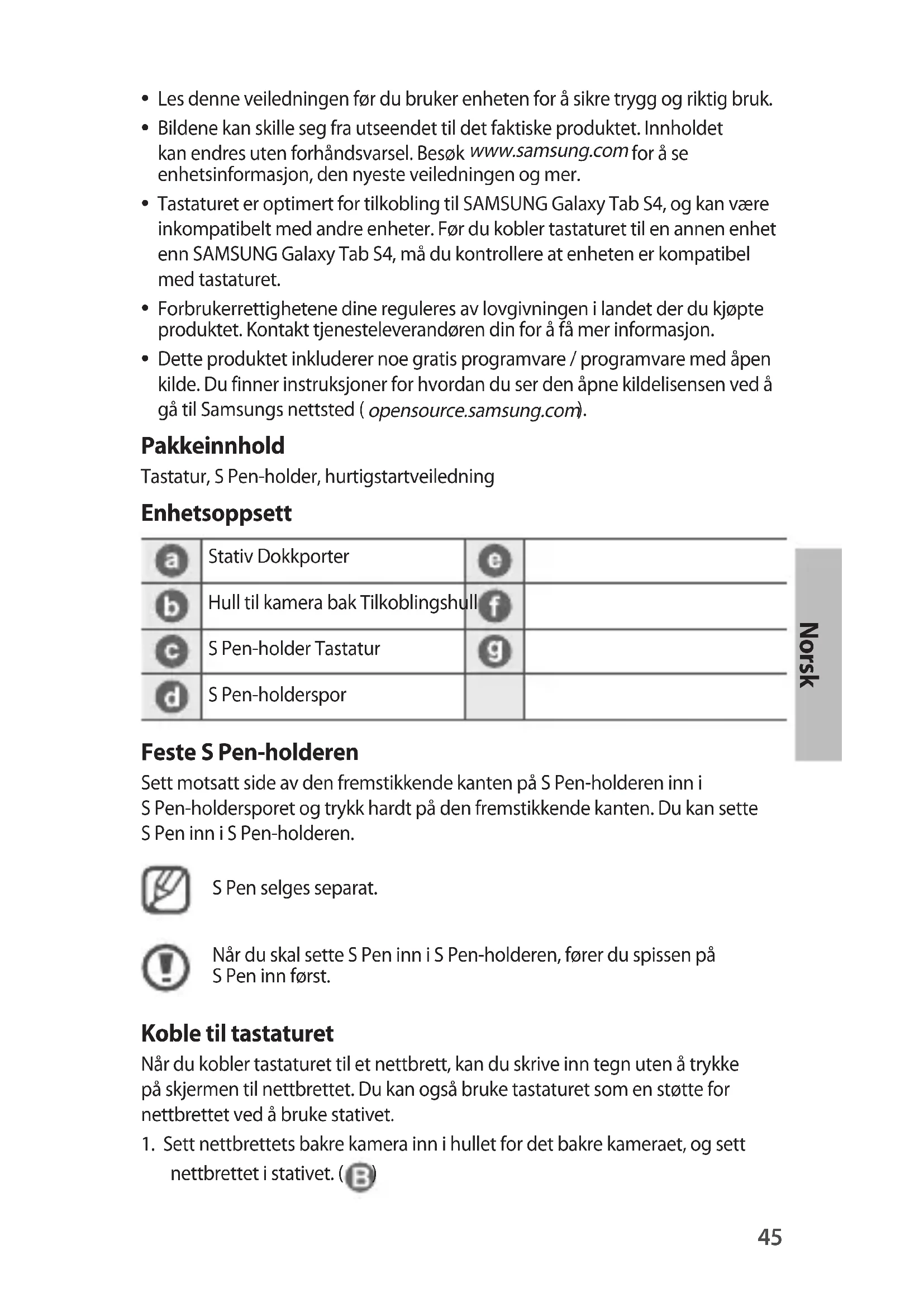 Pakkeinnhold Tastatur, S Pen-holder, hurtigstartveiledning Enhetsoppsett Stativ Dokkporter Hull til kamera bak Tilkoblingshull S Pen-holder Tastatur S Pen-holderspor Feste S Pen-holderen Sett motsatt side av den fremstikkende kanten på S Pen-holderen inn i S Pen-holdersporet og trykk hardt på den fremstikkende kanten. Du kan sette S Pen inn i S Pen-holderen. S Pen selges separat. Når du skal sette S Pen inn i S Pen-holderen, fører du spissen på S Pen inn først. Koble til tastaturet Når du kobler tastaturet til et nettbrett, kan du skrive inn tegn uten å trykke på skjermen til nettbrettet. Du kan også bruke tastaturet som en støtte for nettbrettet ved å bruke stativet.