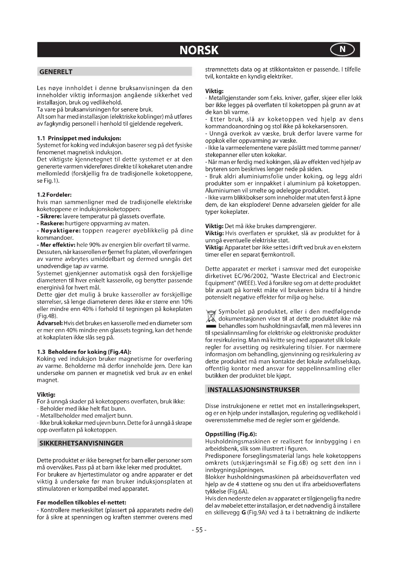 hvis man sammenligner med de tradisjonelle elektriske koketoppene er induksjonskoketoppen: -Sikrere:lavere temperatur på glassets overate. -Raskere:hurtigere oppvarming av maten. -Nøyaktigere:toppen reagerer øyeblikkelig på dine kommandoer. -Mereektiv:hele 90% av energien blir overført til varme. Dessuten, når kasserollen er ernet fra platen, vil overføringen av varme avbrytes umiddelbart og dermed unngås det unødvendige tap av varme. Systemet gjenkjenner automatisk også den forskjellige diameteren til hver enkelt kasserolle, og benytter passende energinivå for hvert mål. Dette gjør det mulig å bruke kasseroller av forskjellige størrelser, så lenge diameteren deres ikke er større enn 10% eller mindre enn 40% i forhold til tegningen på kokeplaten (Fig.4B). Advarsel: Hvis det brukes en kasserolle med en diameter som er mer enn 40% mindre enn glassets tegning, kan det hende at kokaplaten ikke slås seg på. 1.3Beholdereforkoking(Fig.4A): Koking ved induksjon bruker magnetisme for overføring av varme. Beholderne må derfor inneholde jern. Dere kan undersøke om pannen er magnetisk ved bruk av en enkel magnet. Viktig: For å unngå skader på koketoppens overaten, bruk ikke: - Beholder med ikke helt at bunn. - Metallbeholder med emaljert bunn. - Ikke bruk kokekar med ujevn bunn. Dette for å unngå å skrape opp overaten på koketoppen. SIKKERHETSANVISNINGER Dette produktet er ikke beregnet for barn eller personer som må overvåkes. Pass på at barn ikke leker med produktet. For brukere av hjertestimulator og andre apparater er det viktig å undersøke før man bruker induksjonsplaten at stimulatoren er kompatibel med apparatet. Førmodellentilkoblesel-nettet: - Kontrollere merkeskiltet (plassert på apparatets nedre del) for å sikre at spenningen og kraften stemmer overens med strømnettets data og at stikkontakten er passende. I tilfelle tvil, kontakte en kyndig elektriker. Viktig: - Metallgjenstander som f.eks. kniver, gaer, skjeer eller lokk bør ikke legges på overaten til koketoppen på grunn av at de kan bli varme. - Etter bruk, slå av koketoppen ved hjelp av dens kommandoanordning og stol ikke på kokekarsensoren. - Unngå overkok av væske, bruk derfor lavere varme for oppkok eller oppvarming av væske. - Ikke la varmeelementene være påslått med tomme panner/ stekepanner eller uten kokekar. - Når man er ferdig med kokingen, slå av eekten ved hjelp av bryteren som beskrives lenger nede på siden. - Bruk aldri aluminiumsfolie under koking, og legg aldri produkter som er innpakket i aluminium på koketoppen. Aluminiumen vil smelte og ødelegge produktet. - Ikke varm blikkbokser som inneholder mat uten først å åpne dem, de kan eksplodere! Denne advarselen gjelder for alle typer kokeplater. Viktig:Det må ikke brukes damprengjører. Viktig:Hvis overaten er sprukket, slå av produktet for å unngå eventuelle elektriske støt. Viktig:Apparatet bør ikke settes i drift ved bruk av en ekstern timer eller en separat ernkontroll. Dette apparatet er merket i samsvar med det europeiske dirketivet EC/96/2002, "Waste Electrical and Electronic Equipment" (WEEE). Ved å forsikre seg om at dette produktet blir avsatt på korrekt måte vil brukeren bidra til å hindre potensielt negative eekter for miljø og helse. Symbolet på produktet, eller i den medfølgende dokumentasjonen viser til at dette produktet ikke må behandles som husholdningsavfall, men må leveres inn til spesialinnsamling for elektriske og elektroniske produkter for resirkulering. Man må kvitte seg med apparatet slik lokale regler for avsetting og resirkulering tilsier. For nærmere informasjon om behandling, gjenvinning og resirkulering av dette produktet må man kontakte det lokale avfallsselskap, offentlig kontor med ansvar for søppelinnsamling eller butikken der produktet ble kjøpt. INSTALLASJONSINSTRUKSER Disse instruksjonene er rettet mot en installeringsekspert, og er en hjelp under installasjon, regulering og vedlikehold i overensstemmelse med de regler som er gjeldende. Oppstilling (Fig.6): Husholdningsmaskinen er realisert for innbygging i en arbeidsbenk, slik som illustrert i guren. Predisponere forseglingsmaterial langs hele koketoppens omkrets (utskjæringsmål se Fig.6B) og sett den inn i innbygningsåpningen. Blokker husholdningsmaskinen på arbeidsoveraten ved hjelp av de 4 støttene og snu den ut ifra arbeidsoveratens tykkelse (Fig.6A). Hvis den nederste delen av apparatet er tilgjengelig fra nedre del av møbelet etter installasjon, er det nødvendig å installere en skillevegg G (Fig.9A) ved å ta i betraktning de indikerte - 55 -avstandene (Fig.9B). Hvis man installerer en ovn under, er dette ikke nødvendig (Fig.10A - 10B). Viktig: dersom en stekeovn befinner seg under induksjonstoppen er å foretrekke at den er utstyrt med en avkjølingsvifte. Ikke bruk koketoppen mens rengjøringsfunksjonen PIROLITICA er i funksjon. Væroppmerksom:for at det skal kunne sirkulere så mye frisk luft som mulig, må det være en avstand på minst 40 mm mellom modulen og et hvilket som helst apparat installert under induksjonstoppen (Fig.10B). Man må tillate en passende lufting. For å tillate sirkulasjon av frisk luft, må det være åpninger i kjøkkenmøblene (Fig.9A - 10A). Respektere antallene som indikert i Fig.9B – 10B. Elektriskekoblinger(Fig.2B-Fig.3B): Før man utfører de elektriske koblingene må man forsikre seg om at: - den elektriske jordkabelen må være 2 cm. Lenger i forhold til andre kabler; - anleggets kjennetegn tilfredsstiller de indikasjoner som er gitt på identikasjonsskiltet som benner seg på den nedre delen av arbeidsbenken; - anlegget er utstyrt med en jording som er i henhold til gjeldende regelverk. Jording er obligatorisk. I tilfelle hvitevaren ikke er ustyrt med kabel, benytte typen: “H05V2V2-F” for effekt på opptil 6400 Watt, kabelens tverrsnitt må være på minimum 2.5 mm