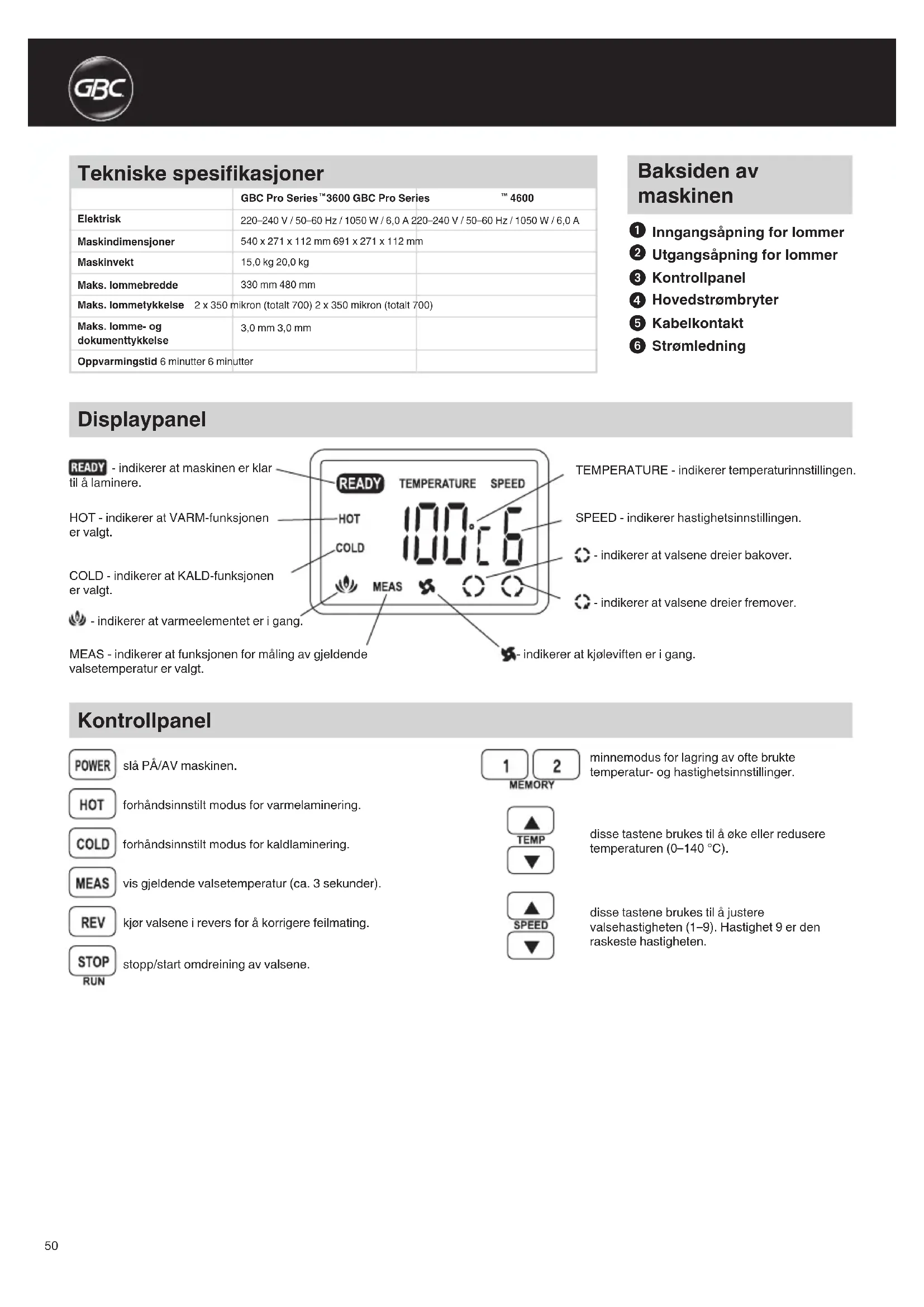 Garanti Denne maskinen har 1 års garanti fra kjøpsdato ved normal bruk. Innenfor denne garantiperioden vil ACCO Brands Europe etter eget forgodtbennende enten reparere eller erstatte enheter med feil, vederlagsfritt. Feil som oppstår på grunn av feil bruk eller bruk til uegnede formål, dekkes ikke av garantien. Kjøpsbevis må fremlegges. Hvis personer som ikke er autorisert av ACCO Brands Europe foretar reparasjoner eller modikasjoner på maskinen, gjøres garantien ugyldig. Det er vårt mål å sørge for at våre produkter er i overensstemmelse med de angitte spesikasjonene. Denne garantien påvirker ikke forbrukerens juridiske rettigheter i henhold til nasjonal lovgivning for salg av varer. Hvis du opplever en teknisk feil med produktet i løpet av garantiperioden, tar du kontakt med det relevante ACCO- servicesenteret. Avhengig av problemtype og modelltype vil vi enten avtale et besøk fra en servicetekniker eller be om at du returnerer maskinen til ACCO. Hvis du returnerer maskinen, vil ACCO, etter eget skjønn og i samsvar med lovgivning, enten (i) reparere maskinen ved hjelp av nye eller renoverte deler, eller (ii) erstatte maskinen med en ny eller renovert maskin som tilsvarer maskinen som byttes ut. Registrer produktet online på www.accobrands.com54 Tekniskaspecikationer GBC Pro Series