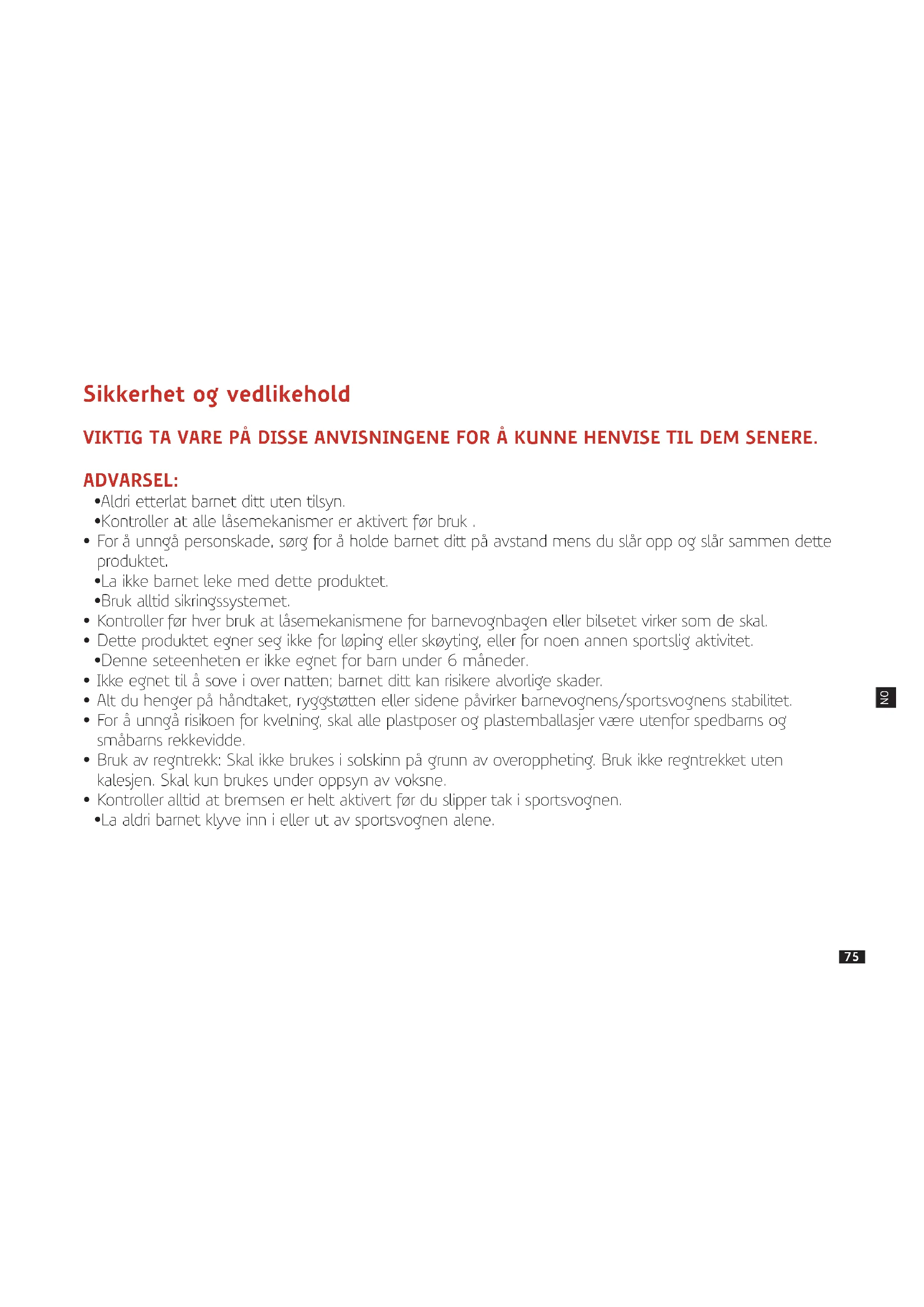 - Bruk av regntrekk: Skal ikke brukes i solskinn på grunn av overoppheting. Bruk ikke regntrekket uten kalesjen. Skal kun brukes under oppsyn av voksne.