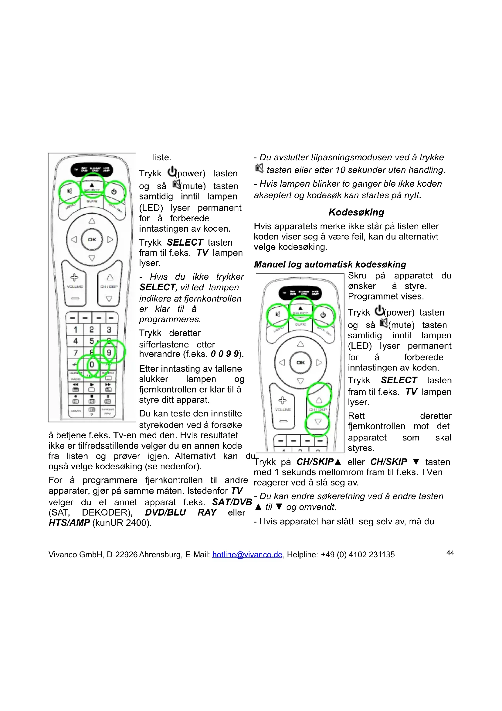 Åpne batteriluken på fjernkontrollens bakside, trykk fliken lett ned og innsett 3 AAA batterier. Sørg for at batterienes poler vender i den riktige retningen (+=+) og lukk batterirommet forsiktig igjen. – Benytt kun feilfrie batterier. - For å sjekke funk- sjonaliteten, trykk en vilkårlig tast. Hvis alt fun- gerer, vil lys bli synlig når en tast trykkes. Tilpassing til apparater Fjernkontrollen (UR) skal tilpasses til de apparater du ønsker å benytte. Dette kan gjøres på tre måter: Enten ved direkte innlesning av styrekode eller ved kodesøking. Direkte innlesning av styrekode Eksempel: Innstilling av fjernkontrollen til en Philips TV: 1 Ta f.eks. Panasonic-koden 0099 fra vedlagte Vivanco GmbH, D-22926 Ahrensburg, E-Mail: hotline@vivanco.de, Helpline: +49 (0) 4102 231135 43liste. Trykk (power) tasten og så (mute) tasten samtidig inntil lampen (LED) lyser permanent for å forberede inntastingen av koden. Trykk SELECT tasten fram til f.eks. TV lampen lyser. - Hvis du ikke trykker SELECT, vil led lampen indikere at fjernkontrollen er klar til å programmeres. Trykk deretter siffertastene etter hverandre (f.eks. 0 0 9 9). Etter inntasting av tallene slukker lampen og fjernkontrollen er klar til å styre ditt apparat. Du kan teste den innstilte styrekoden ved å forsøke å betjene f.eks. Tv-en med den. Hvis resultatet ikke er tilfredsstillende velger du en annen kode fra listen og prøver igjen. Alternativt kan du også velge kodesøking (se nedenfor). For å programmere fjernkontrollen til andre apparater, gjør på samme måten. Istedenfor TV velger du et annet apparat f.eks. SAT/DVB (SAT, DEKODER), DVD/BLU RAY eller HTS/AMP (kunUR 2400). - Du avslutter tilpasningsmodusen ved å trykke tasten eller etter 10 sekunder uten handling. - Hvis lampen blinker to ganger ble ikke koden akseptert og kodesøk kan startes på nytt. Kodesøking Hvis apparatets merke ikke står på listen eller koden viser seg å være feil, kan du alternativt velge kodesøking. Manuel log automatisk kodesøking Skru på apparatet du ønsker å styre. Programmet vises. Trykk (power) tasten og så (mute) tasten samtidig inntil lampen (LED) lyser permanent for å forberede inntastingen av koden. Trykk SELECT tasten fram til f.eks. TV lampen lyser. Rett deretter fjernkontrollen mot det apparatet som skal styres. Trykk på CH/SKIP▲ eller CH/SKIP ▼ tasten med 1 sekunds mellomrom fram til f.eks. TVen reagerer ved å slå seg av. - Du kan endre søkeretning ved å endre tasten ▲ til ▼ og omvendt. - Hvis apparatet har slått seg selv av, må du Vivanco GmbH, D-22926 Ahrensburg, E-Mail: hotline@vivanco.de, Helpline: +49 (0) 4102 231135 44skru det på igjen f.eks. på apparatet eller med original fjernkontrollen, for å fortsette søket. - Når apparatet ditt reagerer kan du også prøve andre taster, utenom ▲ eller ▼ eller , uten å avslutte søket. Hvis noen taster ikke fungerer, fortsett søket ved å trykke på ▲ eller ▼ igjen. Aktivere og deaktivere automatisk kodesøk::Trykk og hold ▲ eller ▼ tasten inntil lampen(LED) skrur seg av. Nå blir en power on/off kommando sendt ut pr. kode, en etter en og lampen blinker. Bytt til manuelt kodesøk igjen ved å trykke en knapp, utenom eller OK. Når ditt apparat reagerer korrekt, trykk (eller OK), for å avslutte søk og lagre funnet kode. Lampen (LED) slukker. - Den siste koden som ble trykket blir lagret. Søket stopper etter ca. 30 sekunder med inaktivitet eller ved slutten av kodelisten. Kodeidentifikasjon Du kan til enhver tid lese av den 4-siffrede koden: 1 Trykk SELECT tasten fram til f.eks. TV lampen lyser. 2 Trykk (power) tasten og så 1, 2, 3 eller 4 tasten samtidig ut i fra hvilken del av koden du ønsker å identifisere. For eksempel, hvis du presser +1 og aktuell kode er 1234, vil lampen blinke en gang etter at +1 er trykket for å vise at tusentallet er 1. Du behøver altså kun å telle. Hundredesifferet vises etter at +2 er trykket, altså blinker lampen to ganger for å vise 2 tallet i 1234. 10er posisjonen vises etter at +3 er trykket, altså blinker lampen tre ganger for å vise 3 tallet i 1234. Med +4 vises kodens første posisjon etter at du har trykket, f.eks. blinker den 4 ganger for 4-tallet i 1234. - Lampen vil ikke blinke i tilfelle tallet er 0. Læring av Manglende Kontroll Funksjoner (kun UR 2400) Lære funksjonen brukes for å supplere på de forhåndsprogrammerte kodene. Standard koden kan tilby de fleste av kodene som trengs, men du kan miste noen knapp funksjoner. Eller at du ikke fant noen fungerende forhåndsprogrammer- te koder for et apparat. Du kan fange opptil 206 taste funksjonskoder, maks. 40 pr. enhet. Den sist lærte funksjonen vil overskrive den forrige. 1 For å lære knappekoder må du bruke en fun- gerende original fjernkontroll. Bruk nye batterier til begge fjernkontrollene. 2 Pek den originale fjernkontrollens sender LED mot mottaker LED på UR 2400 (plassert på toppen, sammen med sender LED). Det bør være ca. 1-2 cm imellom fjernkontrollenes LED og i direkte linje ovenfor hverandre. - Noen ganger må du flytte fjernkontrollene fram og tilbake mens de lærer, for å finne riktig posi- sjon. 3 Trykk LEARN tasten i ca. 3 sekunder inntil LED (lampen) lyser. 4 Trykk SELECT tasten for å velge kontrollert apparat helt til TV LED lyser. Vivanco GmbH, D-22926 Ahrensburg, E-Mail: hotline@vivanco.de, Helpline: +49 (0) 4102 231135 455 Trykk og slipp mål knappen på UR 2400 som du ønsker å lære (omprogrammere) (f.eks. POWER), LED lampen blinker. 6 Trykk og hold nede kilde knappen på den ori- ginale fjernkontrollen (f.eks. POWER) inntil LED lampen på din UR 2400 fjernkontroll slut- ter å blinke og lyser fast. Dette betyr at den nye funksjonen, f.eks. POWER, er lært. 7 Gjennta trinn 5 til 6 for å lære andre knapp funksjoner. 8 Trykk og slipp LEARN knappen for å avslutte Lære modus. - Fjernkontrollen vil avslutte Lære modusen automatisk etter ca. 10 sekunder uten aktivitet. - Minne fullt indikasjon: 