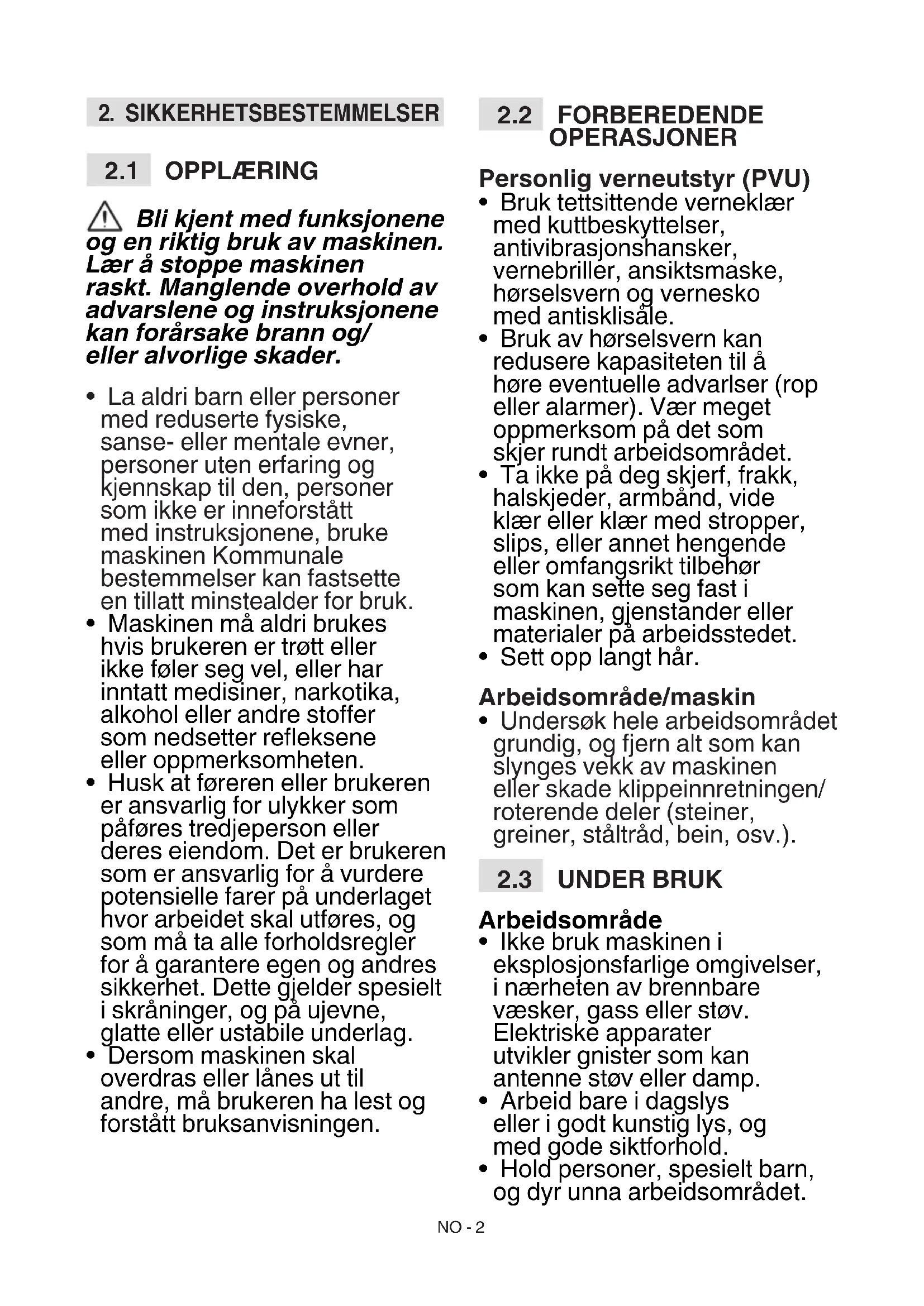 - Unngå så langt som mulig å arbeide på vått eller glatt underlag, og uansett ikke i altfor bratt eller kupert terreng som ikke garanterer brukerens stabilitet under arbeidet.