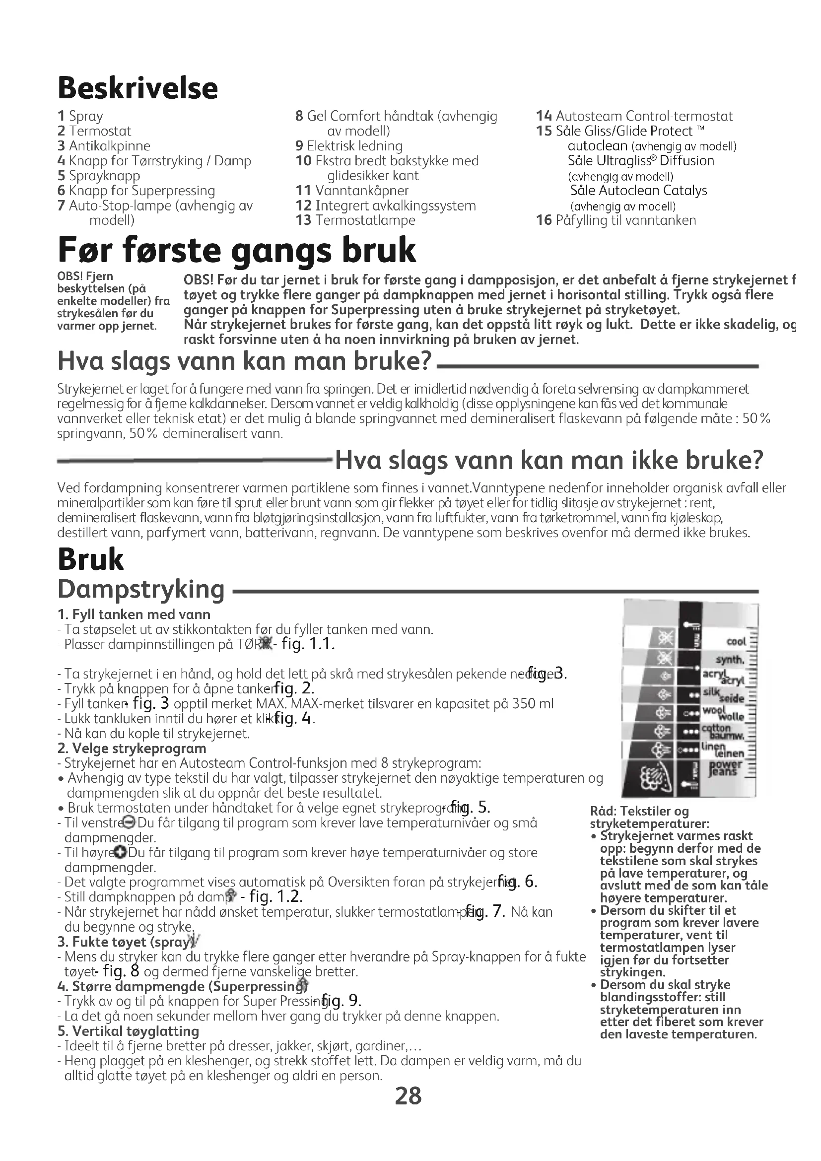 - Et strykejern med et mangelfullt program kan likevel etterlate spor som krever rengjøring. I dette tilfellet er det tilrådelig å anvende en myk, fuktig klut på sålen mens den fortsatt er varm for å unngå skader på belegget .Ditt strykejern er utstyrt med Ultragliss såle (avhengig av modell):• Bruk aldri etsende eller slipende produkter.• Når sålen fortsatt er varm, tørk med en fuktig klut. Oppbevaring - Trekk støpselet ut av stikkontakten og vent til strykesålen er avkjølt.- Tøm vanntanken og sett dampinnstillingen på TØRR - fig. 1.1. Det kan være litt vann igjen på vanntanken.- Rull ledningen rundt den bakre delen av strykejernet.