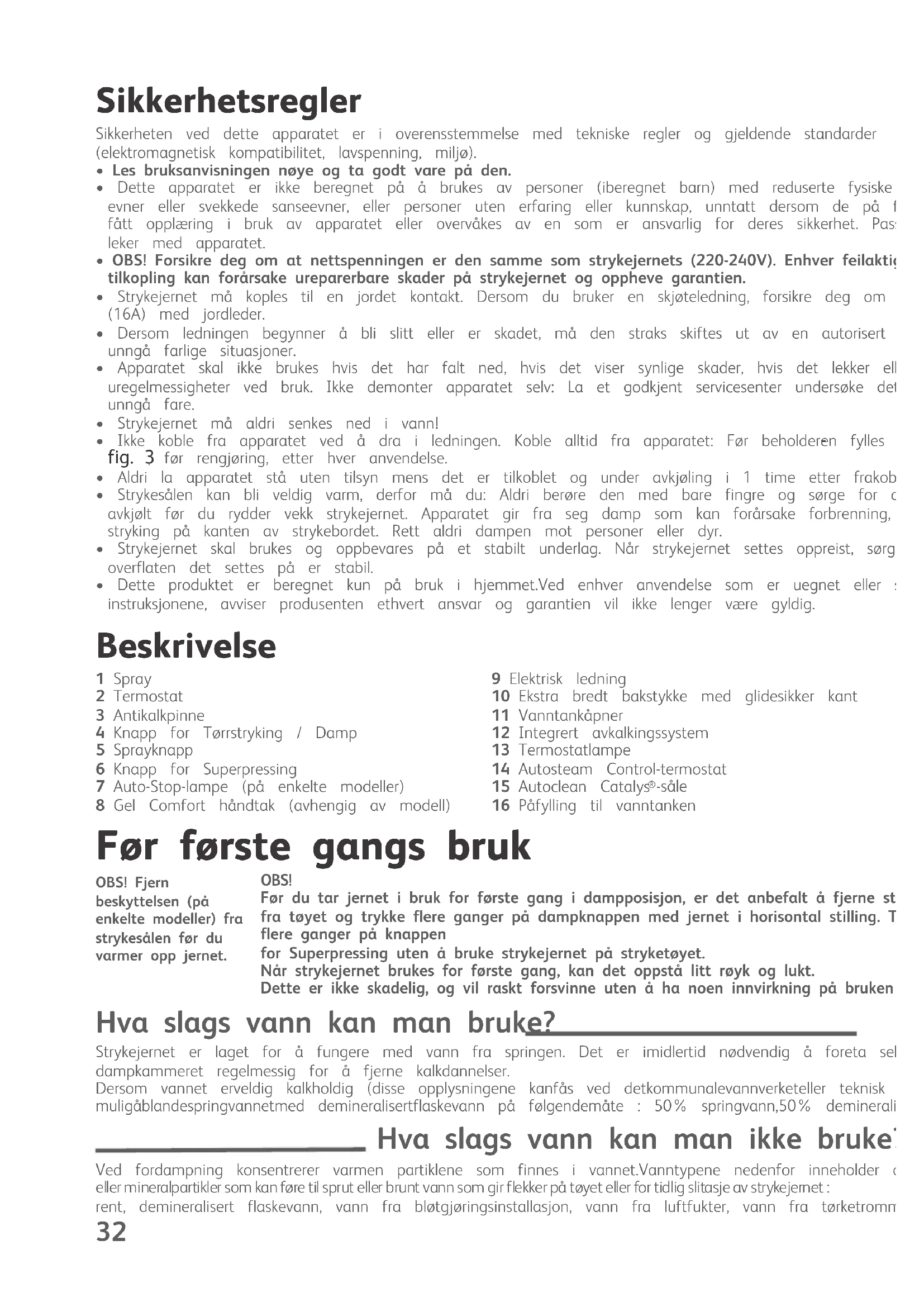 NB ! Det er normalt attermostatlampen erslukket når auto-stopper i funksjon. UltimateAutoclean-1800113015-110x154:Mise en page 1 23/07/08 9:17 Page 3334 9.Autoclean Catalys®-såle- Strykejernet er utstyrt med en selvrensende såle - fig. 14 som fungerer basert på katalyse.- Det eksklusive belegget eliminerer kontinuerlig urenheter som kommer av normal bruk. Detanbefales å alltid sette strykejernet på hælen for å beskytte det selvrensende belegget. Tørrstryking - Velg ønsket strykeprogram.- Sett dampknappen på TØRR - fig. 1. - Du kan begynne å stryke når lampen slukker. Vedlikehold av strykjernet OBS ! Ta støpselet ut av stikkontakten og vent til strykesålen er avkjølt før du rengjør det. Rengjøring av avkalkingspinnen (en gang i måneden) - Ta ut støpselet av stikkontakten og tøm vanntanken for vann.- For å ta ut antikalkpinnen må du sette termostaten på MAX - fig. 10 , sett dampknappen på DAMP , Nå kanpinnen tas ut - fig. 15. Du må aldri berøre enden på avkalkingspinnen - La pinnen ligge 4 timer i klar eddik eller ren sitronsaft - fig. 16. - Skyll pinnen under springen.- Sett deretter pinnen tilbake på plass. Strykejernet fungerer ikke uten avkalkingspinnen 1. Foreta selvrensingFor å forlenge strykejernets levetid, foreta selvrensing en gang i måneden.- Still dampknappen på TØRR .-Sett strykejernetpå sålenmed fulltank og sett termostatenpå MAX - fig. 10.-Nårlampen slukker,trekk ut støpseletav stikkontakten oghold strykejernethorisontaltovervasken.- Fjern avkalkingspinnen.-Rist lett i strykejernet overvasken helt tilvannet (med urenheter)har rent utgjennom strykesålen.- Nåroperasjonen er ferdig skal avkalkingspinnen settes tilbake påplass.-Sett støpseleti stikkontaktenigjen, ogplasserstrykejernetpå høykant for åtørke sålen i 2minutter.-Ta utstøpselet fra stikkontaktenigjen, ogtørk strykesålen med enmyk klut mens den ennå erlunken.2. Rengjøring av strykesålenStrykejerneter utstyrtmed en selvrensendesålesom fungererbasert på katalyse.Deteksklusive,aktive belegget eliminerer kontinuerligurenhetersom kan oppstå undernormal,dagligbruk.Strykingmed et uegnetprogramkanlikeveletterlate spor somtrenger manuell rengjøring.Daanbefales det å bruke en myk ogfuktigklutpå enfortsatt lunkensåleforikke å skade belegget. Oppbevaring - Trekk støpselet ut av stikkontakten og vent til strykesålen er avkjølt.- Tøm vanntanken og sett dampinnstillingen på TØRR . Det kan være litt vann igjen på vanntanken.- Rull ledningen rundt den bakre delen av strykejernet.- Rydd strykejernet bort og la det bli stående på høykant.Råd : Selvrensingforsinker kalkdannelseri strykejernet.Forsiktig!Dampknappen må ståpå DAMP for åkunne fjerne eller settepå plassantikalkpinnen.Forsiktig!Skuresvamper kanskade sålensselvrensende belegg