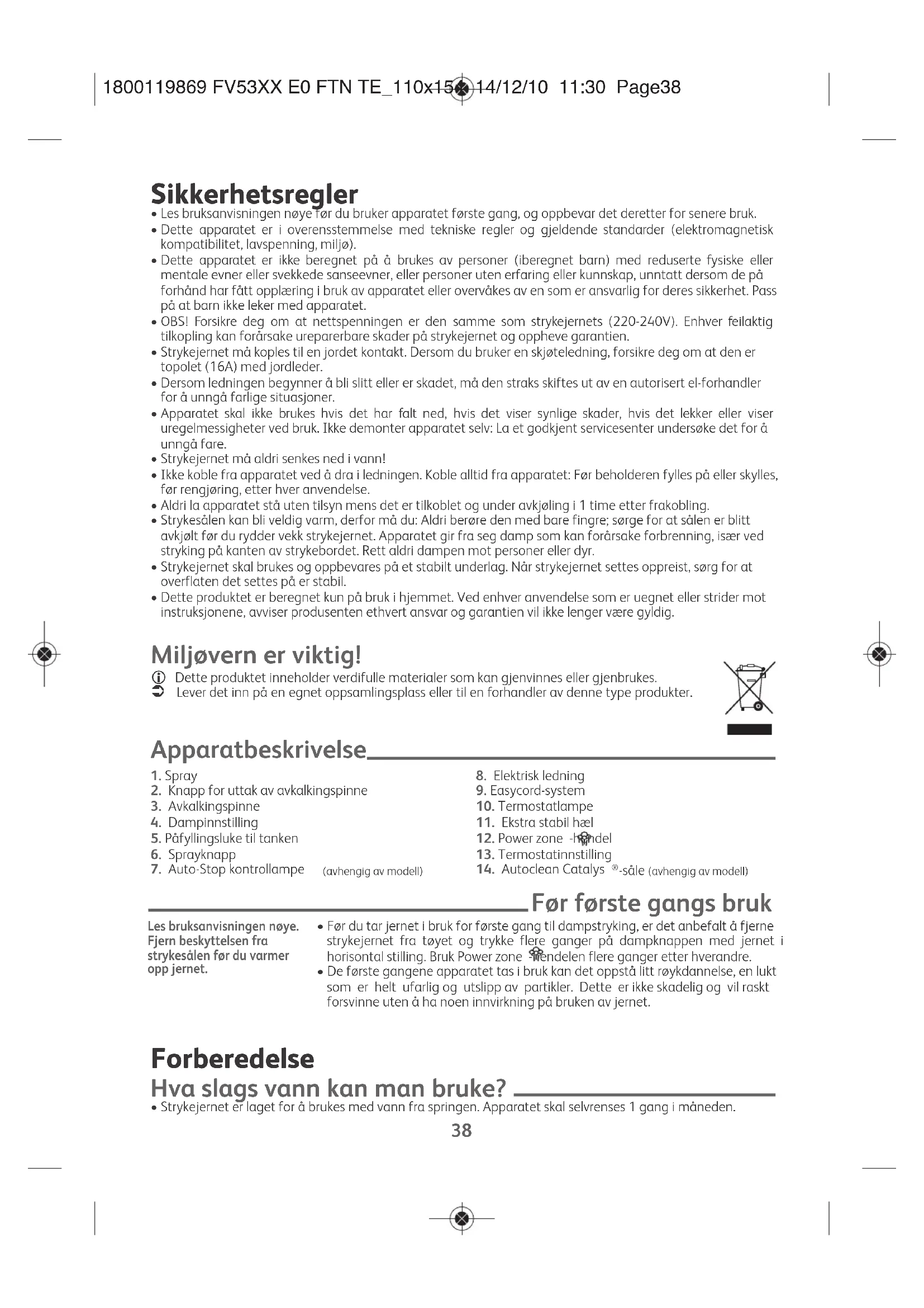 - Strykejernet er laget for å brukes med vann fra springen. Apparatet skal selvrenses 1 gang i måneden. Les bruksanvisningen nøye. Fjern beskyttelsen fra strykesålen før du varmer opp jernet. 1800119869 FV53XX E0 FTN TE_110x154 14/12/10 11:30 Page38EN
