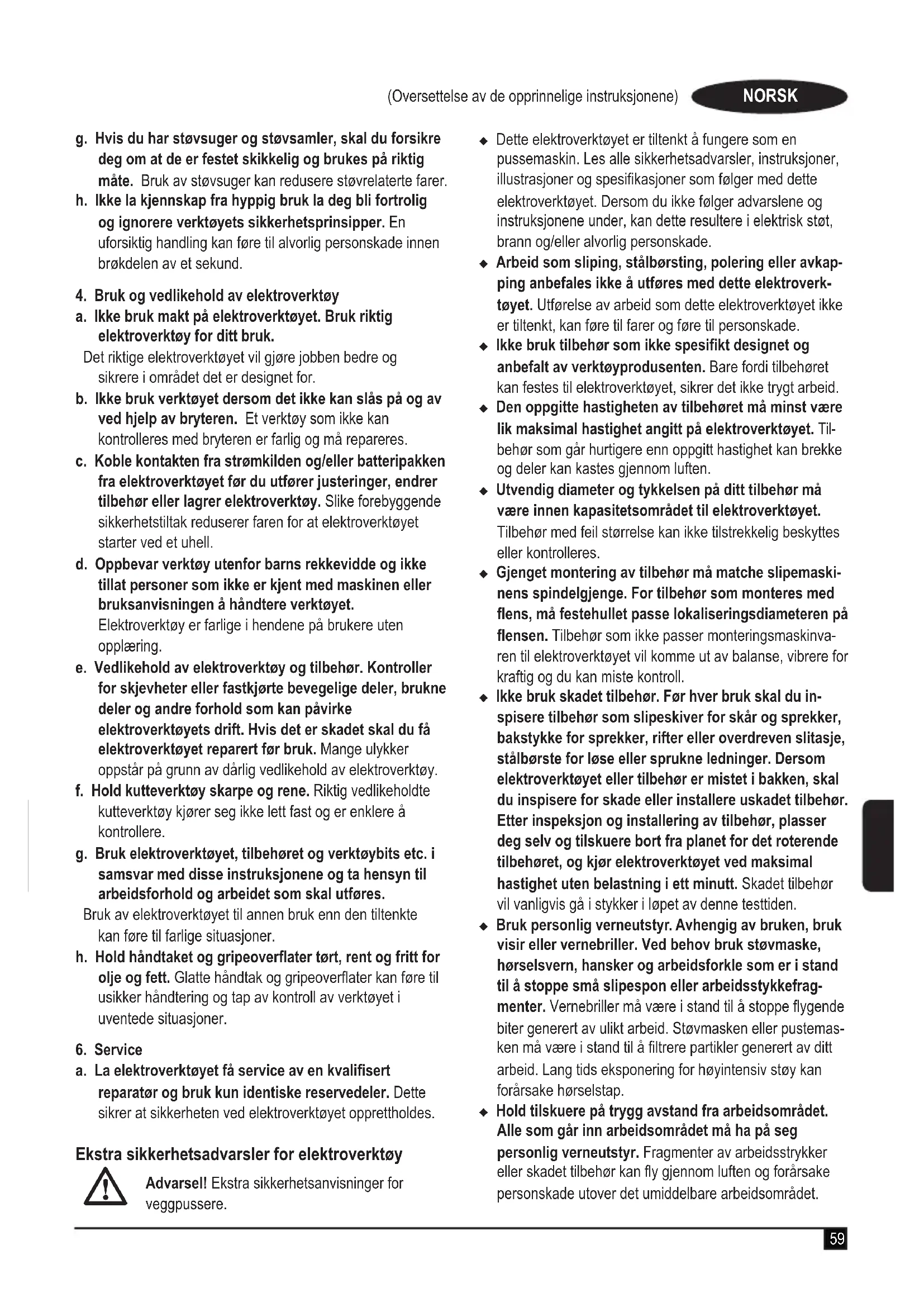 a. La elektroverktøyet få service av en kvalisert reparatør og bruk kun identiske reservedeler. Dette sikrer at sikkerheten ved elektroverktøyet opprettholdes. Ekstra sikkerhetsadvarsler for elektroverktøy