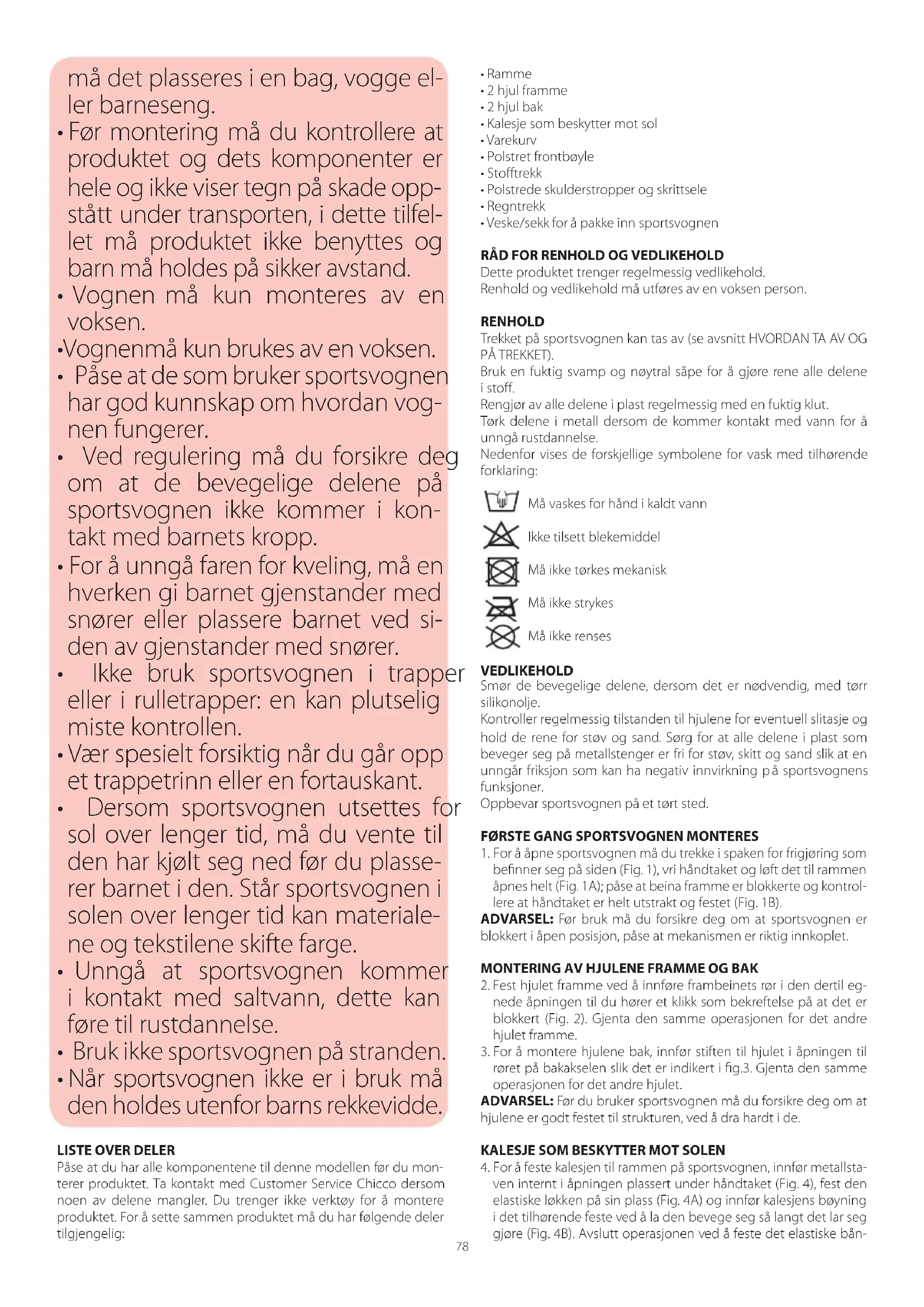 Dette produktet trenger regelmessig vedlikehold. Renhold og vedlikehold må utføres av en voksen person. RENHOLD Trekket på sportsvognen kan tas av (se avsnitt HVORDAN TA AV OG PÅ TREKKET). Bruk en fuktig svamp og nøytral såpe for å gjøre rene alle delene i sto. Rengjør av alle delene i plast regelmessig med en fuktig klut. Tørk delene i metall dersom de kommer kontakt med vann for å unngå rustdannelse. Nedenfor vises de forskjellige symbolene for vask med tilhørende forklaring: Må vaskes for hånd i kaldt vann Ikke tilsett blekemiddel Må ikke tørkes mekanisk Må ikke strykes Må ikke renses VEDLIKEHOLD Smør de bevegelige delene, dersom det er nødvendig, med tørr silikonolje. Kontroller regelmessig tilstanden til hjulene for eventuell slitasje og hold de rene for støv og sand. Sørg for at alle delene i plast som beveger seg på metallstenger er fri for støv, skitt og sand slik at en unngår friksjon som kan ha negativ innvirkning p å sportsvognens funksjoner. Oppbevar sportsvognen på et tørt sted.