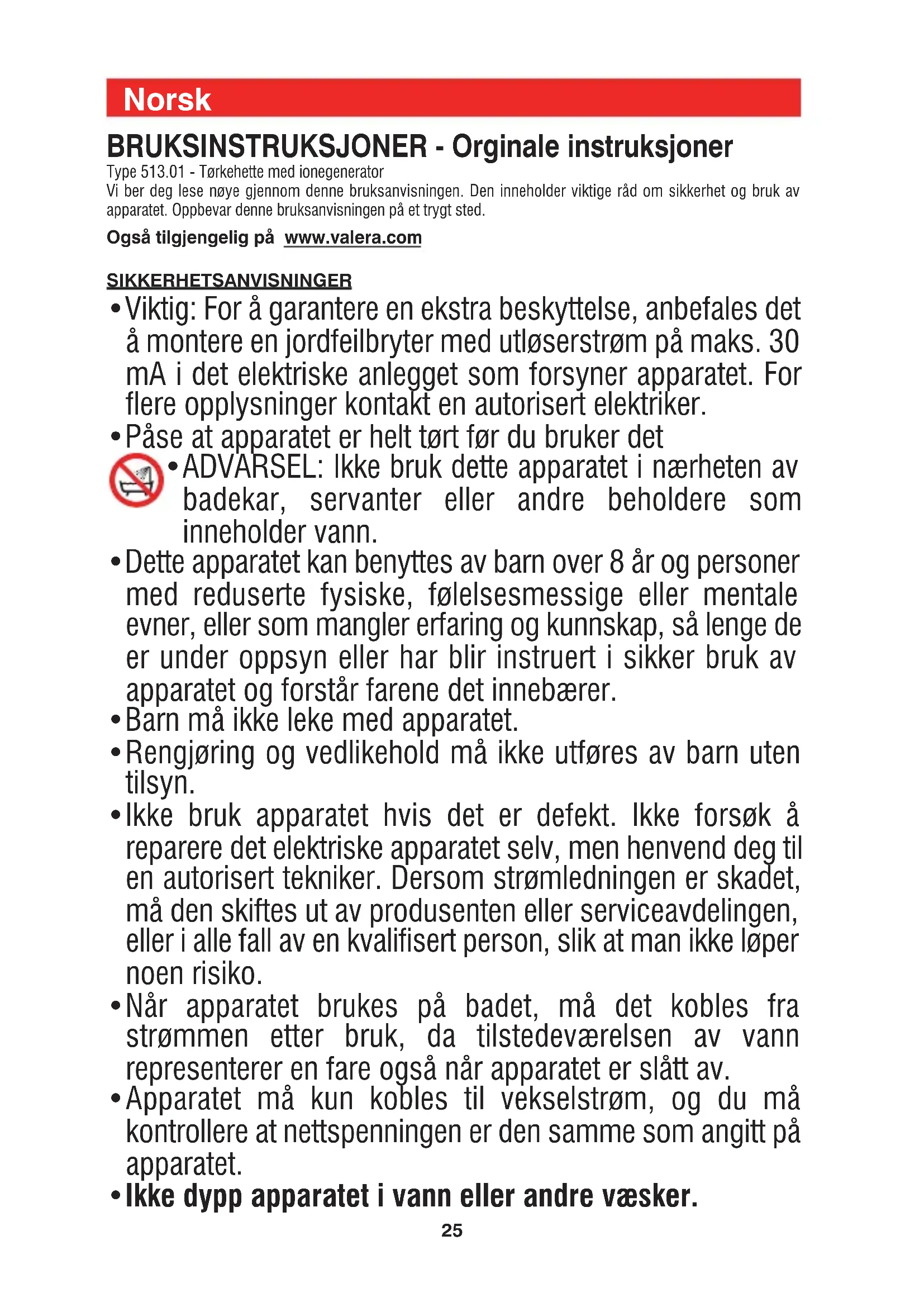 - ADVARSEL: Ikke bruk dette apparatet i nærheten av badekar, servanter eller andre beholdere som inneholder vann.