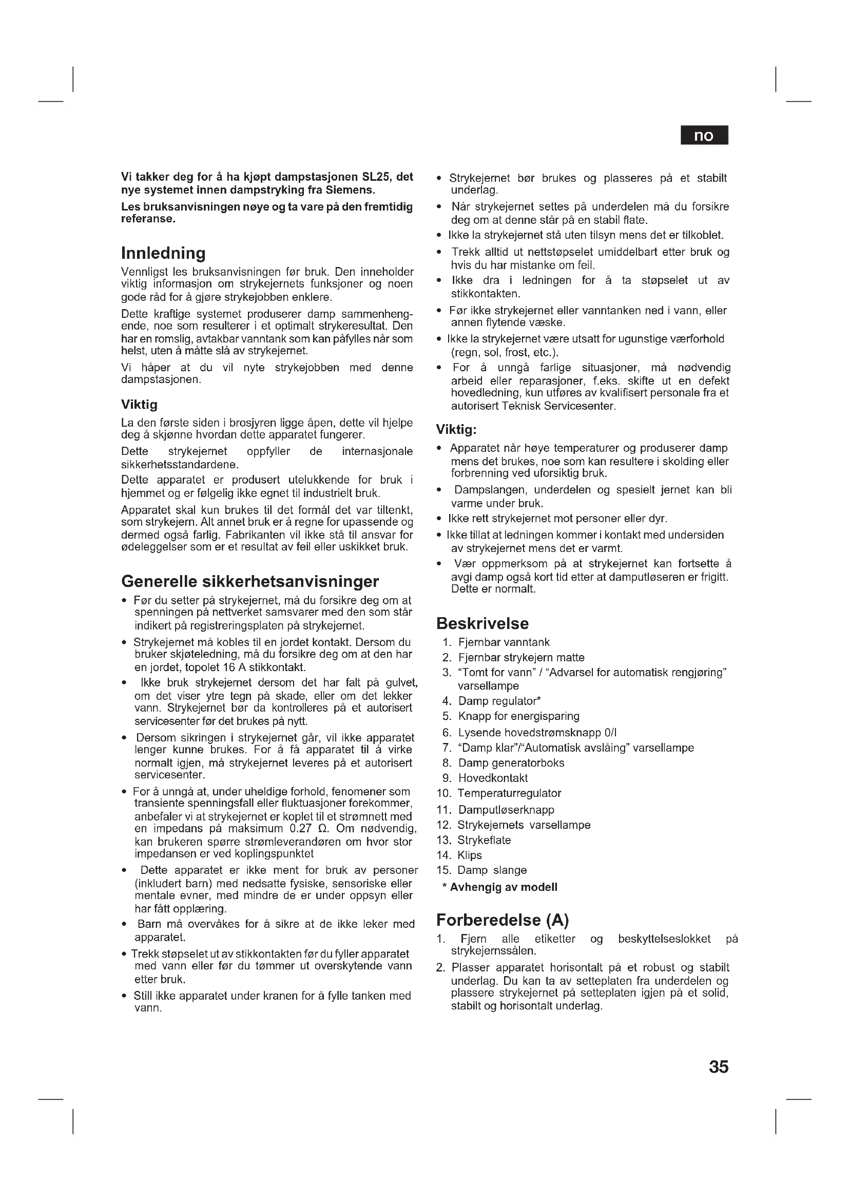 Vi takker deg for å ha kjøpt dampstasjonen SL25, det nye systemet innen dampstryking fra Siemens. Les bruksanvisningen nøye og ta vare på den fremtidig referanse. Innledning Vennligst les bruksanvisningen før bruk. Den inneholder viktig informasjon om strykejernets funksjoner og noen gode råd for å gjøre strykejobben enklere. Dette kraftige systemet produserer damp sammenheng- ende, noe som resulterer i et optimalt strykeresultat. Den har en romslig, avtakbar vanntank som kan påfylles når som helst, uten å måtte slå av strykejernet. Vi håper at du vil nyte strykejobben med denne dampstasjonen. Viktig La den første siden i brosjyren ligge åpen, dette vil hjelpe deg å skjønne hvordan dette apparatet fungerer. Dette strykejernet oppfyller de internasjonale sikkerhetsstandardene. Dette apparatet er produsert utelukkende for bruk i hjemmet og er følgelig ikke egnet til industrielt bruk. Apparatet skal kun brukes til det formål det var tiltenkt, som strykejern. Alt annet bruk er å regne for upassende og dermed også farlig. Fabrikanten vil ikke stå til ansvar for ødeleggelser som er et resultat av feil eller uskikket bruk. Generelle sikkerhetsanvisninger