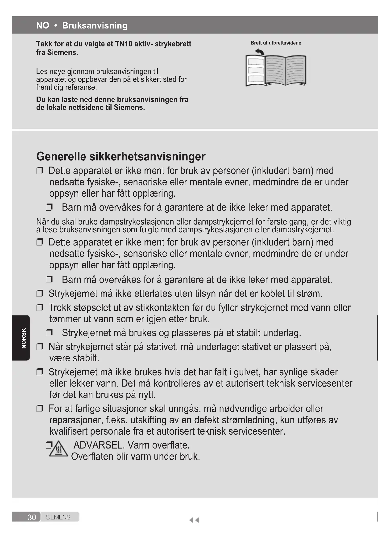 ADVARSEL. Varm overate. Overaten blir varm under bruk. NO • Bruksanvisning Takk for at du valgte et TN10 aktiv- strykebrett fra Siemens. Les nøye gjennom bruksanvisningen til apparatet og oppbevar den på et sikkert sted for fremtidig referanse. Du kan laste ned denne bruksanvisningen fra de lokale nettsidene til Siemens.31 S I E M E N S NorSk Produktbeskrivelse