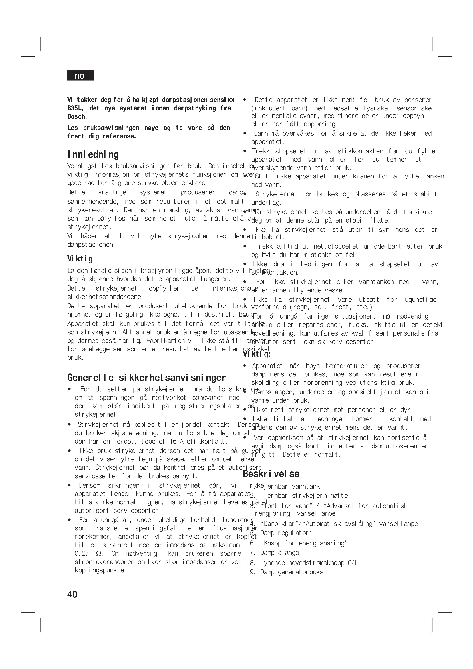 Vi takker deg for å ha kjøpt dampstasjonen sensixx B35L, det nye systemet innen dampstryking fra Bosch. Les bruksanvisningen nøye og ta vare på den fremtidig referanse. Innledning Vennligst les bruksanvisningen før bruk. Den inneholder viktig informasjon om strykejernets funksjoner og noen gode råd for å gjøre strykejobben enklere. Dette kraftige systemet produserer damp sammenhengende, noe som resulterer i et optimalt strykeresultat. Den har en romslig, avtakbar vanntank som kan påfylles når som helst, uten å måtte slå av strykejernet. Vi håper at du vil nyte strykejobben med denne dampstasjonen. Viktig La den første siden i brosjyren ligge åpen, dette vil hjelpe deg å skjønne hvordan dette apparatet fungerer. Dette strykejernet oppfyller de internasjonale sikkerhetsstandardene. Dette apparatet er produsert utelukkende for bruk i hjemmet og er følgelig ikke egnet til industrielt bruk. Apparatet skal kun brukes til det formål det var tiltenkt, som strykejern. Alt annet bruk er å regne for upassende og dermed også farlig. Fabrikanten vil ikke stå til ansvar for ødeleggelser som er et resultat av feil eller uskikket bruk. Generelle sikkerhetsanvisninger Før du setter på strykejernet, må du forsikre deg om at spenningen på nettverket samsvarer med den som står indikert på registreringsplaten på strykejernet. Strykejernet må kobles til en jordet kontakt. Dersom du bruker skjøteledning, må du forsikre deg om at den har en jordet, topolet 16 A stikkontakt. Ikke bruk strykejernet dersom det har falt på gulvet, om det viser ytre tegn på skade, eller om det lekker vann. Strykejernet bør da kontrolleres på et autorisert servicesenter før det brukes på nytt. Dersom sikringen i strykejernet går, vil ikke apparatet lenger kunne brukes. For å få apparatet til å virke normalt igjen, må strykejernet leveres på et autorisert servicesenter. For å unngå at, under uheldige forhold, fenomener som transiente spenningsfall eller fluktuasjoner forekommer, anbefaler vi at strykejernet er koplet til et strømnett med en impedans på maksimum