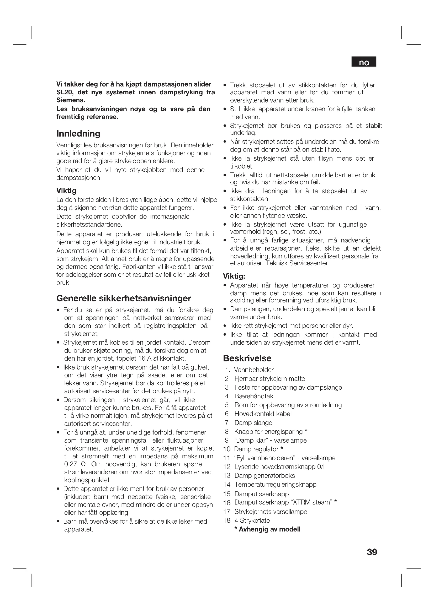Vi takker deg for å ha kjøpt dampstasjonen slider SL20, det nye systemet innen dampstryking fra Siemens. Les bruksanvisningen nøye og ta vare på den fremtidig referanse. Innledning Vennligst les bruksanvisningen før bruk. Den inneholder viktig informasjon om strykejernets funksjoner og noen gode råd for å gjøre strykejobben enklere. Vi håper at du vil nyte strykejobben med denne dampstasjonen. Viktig La den første siden i brosjyren ligge åpen, dette vil hjelpe deg å skjønne hvordan dette apparatet fungerer. Dette strykejernet oppfyller de internasjonale sikkerhetsstandardene. Dette apparatet er produsert utelukkende for bruk i hjemmet og er følgelig ikke egnet til industrielt bruk. Apparatet skal kun brukes til det formål det var tiltenkt, som strykejern. Alt annet bruk er å regne for upassende og dermed også farlig. Fabrikanten vil ikke stå til ansvar for ødeleggelser som er et resultat av feil eller uskikket bruk. Generelle sikkerhetsanvisninger
