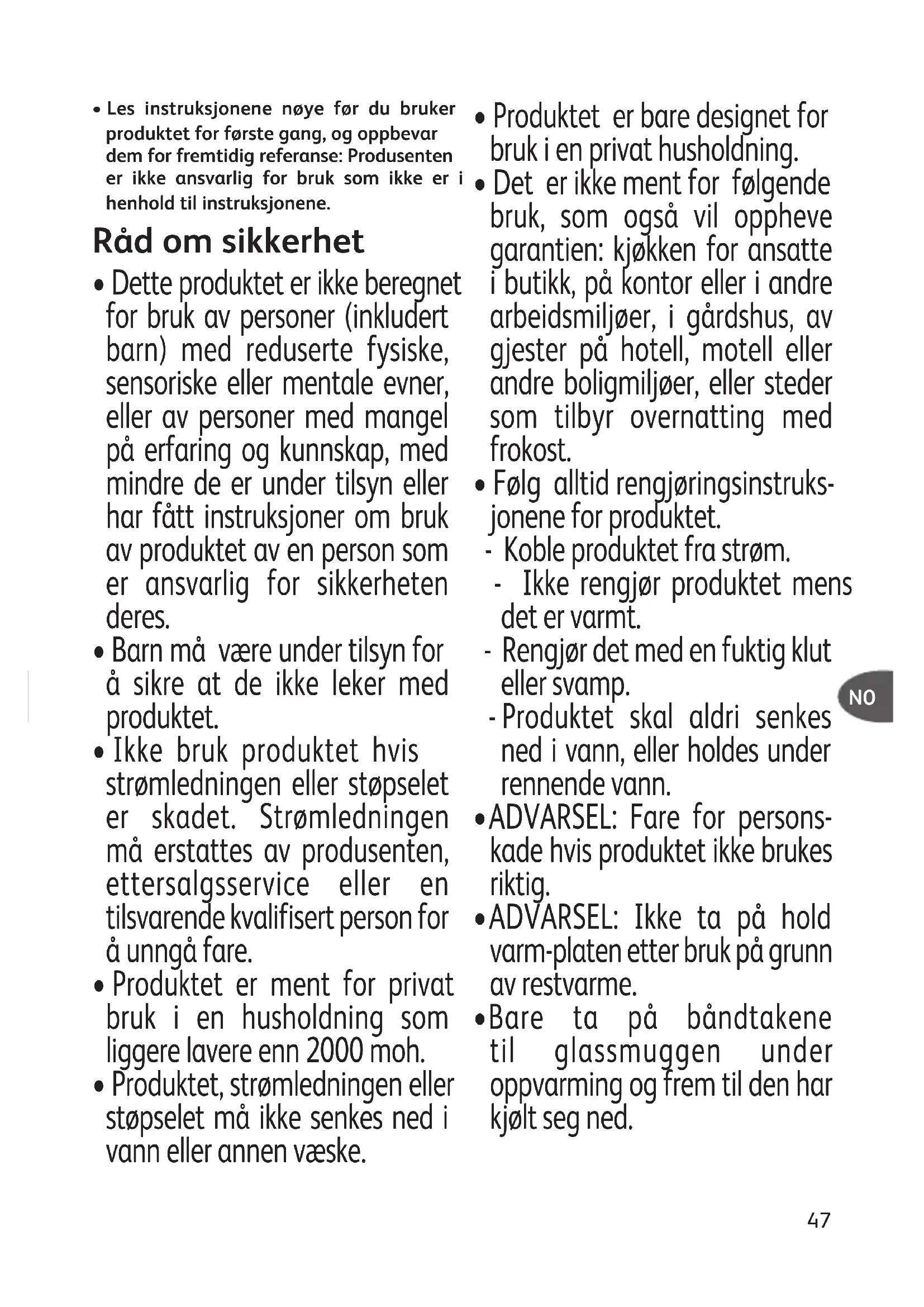 - Bare ta på båndtakene til glassmuggen under oppvarming og frem til den har kjølt seg ned. NO• Dette produktet kan brukes av barn som er minst åtte år, forutsatt at de er under oppsyn, at de har fått instruksjoner om sikker bruk av produktet og at de er fullt klar over farene som er involvert. Rengjøring og vedlikehold skal ikke utføres av barn med mindre de er minst åtte år og er under oppsyn av en voksen.