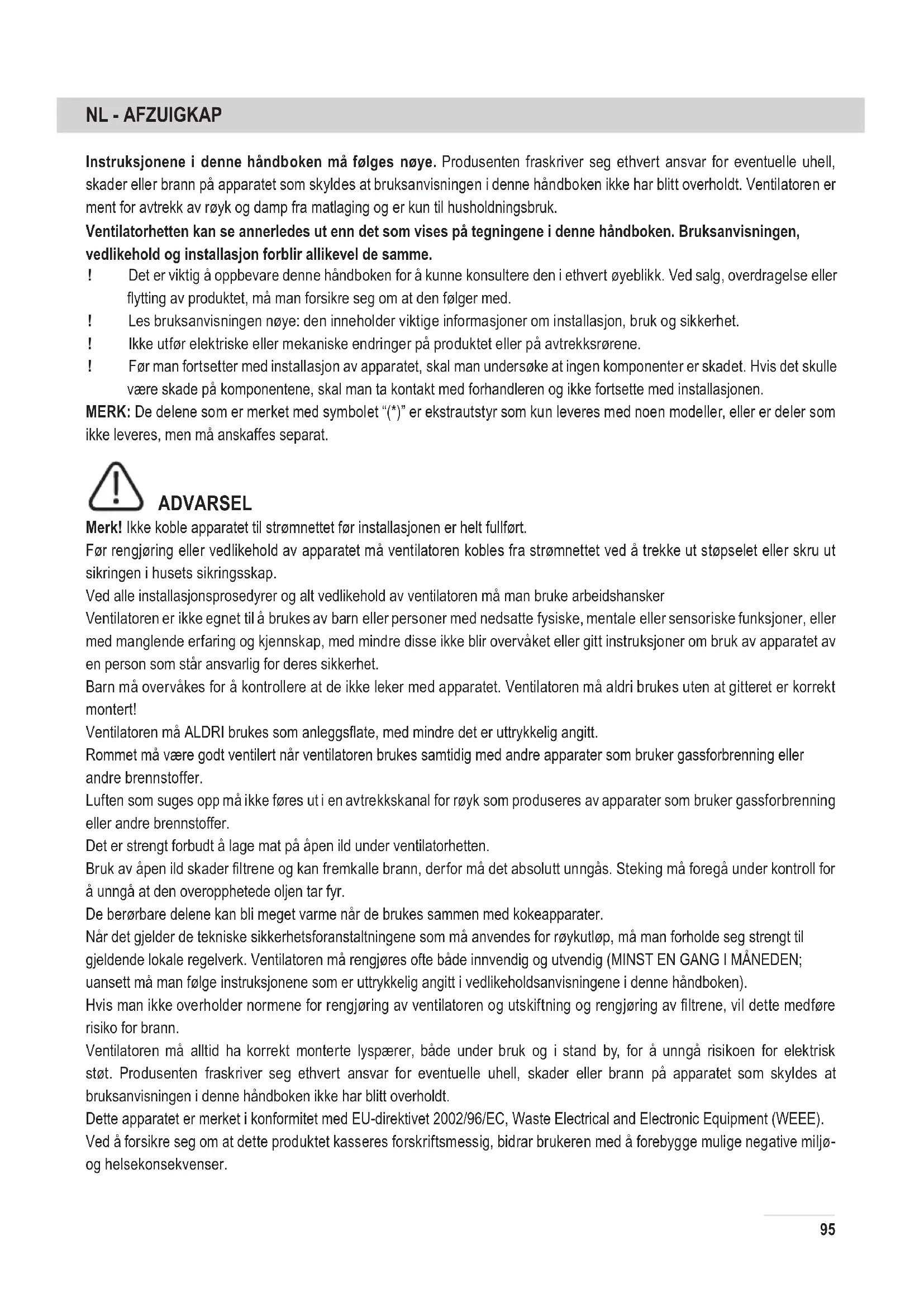 Instruksjonene i denne håndboken må følges nøye. Produsenten fraskriver seg ethvert ansvar for eventuelle uhell, skader eller brann på apparatet som skyldes at bruksanvisningen i denne håndboken ikke har blitt overholdt. Ventilatoren er ment for avtrekk av røyk og damp fra matlaging og er kun til husholdningsbruk. Ventilatorhetten kan se annerledes ut enn det som vises på tegningene i denne håndboken. Bruksanvisningen, vedlikehold og installasjon forblir allikevel de samme. ! Det er viktig å oppbevare denne håndboken for å kunne konsultere den i ethvert øyeblikk. Ved salg, overdragelse eller ytting av produktet, må man forsikre seg om at den følger med. ! Les bruksanvisningen nøye: den inneholder viktige informasjoner om installasjon, bruk og sikkerhet. ! Ikke utfør elektriske eller mekaniske endringer på produktet eller på avtrekksrørene. ! Før man fortsetter med installasjon av apparatet, skal man undersøke at ingen komponenter er skadet. Hvis det skulle være skade på komponentene, skal man ta kontakt med forhandleren og ikke fortsette med installasjonen. MERK: De delene som er merket med symbolet “(*)” er ekstrautstyr som kun leveres med noen modeller, eller er deler som ikke leveres, men må anskaffes separat. ADVARSEL Merk! Ikke koble apparatet til strømnettet før installasjonen er helt fullført. Før rengjøring eller vedlikehold av apparatet må ventilatoren kobles fra strømnettet ved å trekke ut støpselet eller skru ut sikringen i husets sikringsskap. Ved alle installasjonsprosedyrer og alt vedlikehold av ventilatoren må man bruke arbeidshansker Ventilatoren er ikke egnet til å brukes av barn eller personer med nedsatte fysiske, mentale eller sensoriske funksjoner, eller med manglende erfaring og kjennskap, med mindre disse ikke blir overvåket eller gitt instruksjoner om bruk av apparatet av en person som står ansvarlig for deres sikkerhet. Barn må overvåkes for å kontrollere at de ikke leker med apparatet. Ventilatoren må aldri brukes uten at gitteret er korrekt montert! Ventilatoren må ALDRI brukes som anleggsate, med mindre det er uttrykkelig angitt. Rommet må være godt ventilert når ventilatoren brukes samtidig med andre apparater som bruker gassforbrenning eller andre brennstoffer. Luften som suges opp må ikke føres ut i en avtrekkskanal for røyk som produseres av apparater som bruker gassforbrenning eller andre brennstoffer. Det er strengt forbudt å lage mat på åpen ild under ventilatorhetten. Bruk av åpen ild skader ltrene og kan fremkalle brann, derfor må det absolutt unngås. Steking må foregå under kontroll for å unngå at den overopphetede oljen tar fyr. De berørbare delene kan bli meget varme når de brukes sammen med kokeapparater. Når det gjelder de tekniske sikkerhetsforanstaltningene som må anvendes for røykutløp, må man forholde seg strengt til gjeldende lokale regelverk. Ventilatoren må rengjøres ofte både innvendig og utvendig (MINST EN GANG I MÅNEDEN; uansett må man følge instruksjonene som er uttrykkelig angitt i vedlikeholdsanvisningene i denne håndboken). Hvis man ikke overholder normene for rengjøring av ventilatoren og utskiftning og rengjøring av ltrene, vil dette medføre risiko for brann. Ventilatoren må alltid ha korrekt monterte lyspærer, både under bruk og i stand by, for å unngå risikoen for elektrisk støt. Produsenten fraskriver seg ethvert ansvar for eventuelle uhell, skader eller brann på apparatet som skyldes at bruksanvisningen i denne håndboken ikke har blitt overholdt. Dette apparatet er merket i konformitet med EU-direktivet 2002/96/EC, Waste Electrical and Electronic Equipment (WEEE). Ved å forsikre seg om at dette produktet kasseres forskriftsmessig, bidrar brukeren med å forebygge mulige negative miljø- og helsekonsekvenser.96 S y m b o l e t på produktet eller på papirer som følger med viser at dette produktet ikke må behandles som vanlig husholdningsavfall, men må leveres til et egnet gjenvinningssenter for elektrisk og elektronisk avfall. Produktet må kasseres i henhold til lokale normer for kassering av avfall. For videre informasjon om behandling, gjenvinning og resirkulering av dette produktet kan du kontakte egnet lokalt kontor, renovasjonskontoret for husholdningsavfall eller butikken hvor du kjøpte produktet. Apparatet er utformet, testet og produsert i henhold til: