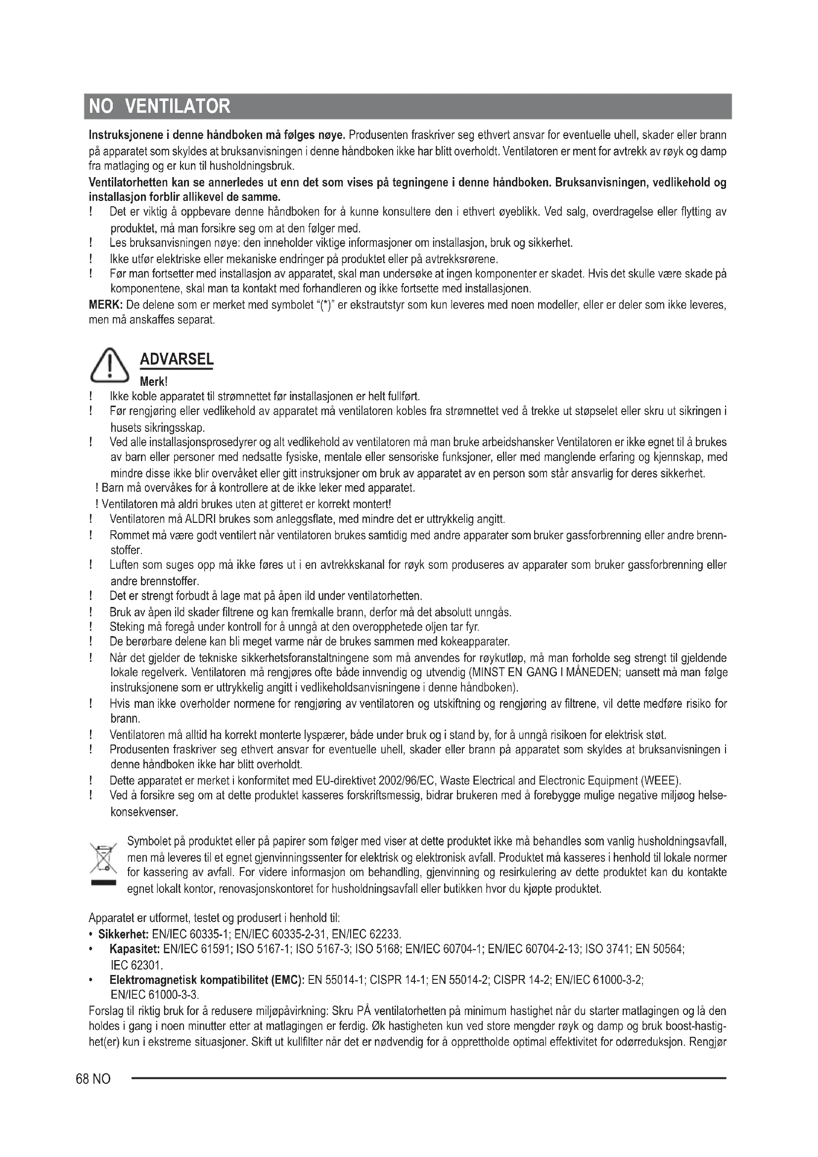 - Elektromagnetisk kompatibilitet (EMC): EN 55014-1; CISPR 14-1; EN 55014-2; CISPR 14-2; EN/IEC 61000-3-2; EN/IEC 61000-3-3. Forslag til riktig bruk for å redusere miljøpåvirkning: Skru PÅ ventilatorhetten på minimum hastighet når du starter matlagingen og lå den holdes i gang i noen minutter etter at matlagingen er ferdig. Øk hastigheten kun ved store mengder røyk og damp og bruk boost-hastig- het(er) kun i ekstreme situasjoner. Skift ut kulllter når det er nødvendig for å opprettholde optimal effektivitet for odørreduksjon. Rengjør69NO fettlter når det er nødvendig for å opprettholde optimal effektivitet for fettlter. Bruk maksimum diameter på kanalsystemet som er angitt i denne bruksanvisningen for å optimalisere effektivitet og minimere støy. ADVARSEL! Manglende installering av skruer og festeanordninger i samsvar med disse instruksjonene kan medføre elektrisk fare. BRUKSMÅTE Ventilatorhetten er laget for å brukes med direkte avtrekk der avtrekksluften føres ut i friluft, eller med resirkulering av avtrekksluften. Direkte avtrekk Dampene føres ut i friluft gjennom et avløpsrør som er festet til koblingsensen. Diameteren i avløpsrøret må tilsvare diameteren på tilslutningsringen. Bemerk! Avløpsrøret er ikke medlevert, men må kjøpes separat. På den vannrette delen skal røret ha en lett inklinasjon oppover (cirka 10°), slik at det lettere kan føre ut luften. Hvis ventilatoren er utstyrt med kullltre, må disse fjernes. Koble ventilatoren til rør og avtrekksåpning i veggen med en diameter tilsvarende luftuttaket (koblingsensen). Bruk av rør og avtrekksåpning på veggen med en mindre diameter, vil medføre en minsking i avtrekksytelsene og en drastisk økning av støyen. Ethvert ansvar gjeldende dette fraskrives derfor. ! Bruk et så kort rør som mulig. ! Bruk et rør med færrest mulig vinkler (vinkelen må aldri være skarpere enn 90°). ! Unngå drastiske endringer i rørets tverrsnitt. ! Bruk et rør som er så glatt som mulig på innsiden. ! Rørmaterialet må være godkjent etter gjeldende normer. Resirkulering av luften Luften som suges opp blir renset, og fett og lukter fjernes før den føres tilbake i rommet. Hvis man vil bruke ventilatoren i denne versjonen, er det nødvendig å installere et ekstra ltersystem basert på aktivt kull. INSTALLASJON Minimumsavstanden mellom koketoppen og undersiden av kjøkkenventilatoren må ikke være på mindre enn 55cm når det gjelder elektris- ke kokeplater og 65cm når det gjelder gassbluss og kombinerte koketopper. Dersom bruksanvisningen for et gasskokeapparat opererer med en større avstand, må denne overholdes. Elektrisk tilslutning Nettspenningen må være i samsvar med den elektriske spenningen som angis på typeskiltet inne i ventilatoren. Hvis det følger med støp- sel, kobles ventilatoren til en lett tilgjengelig stikkontakt som er godkjent i henhold til gjeldende normer. Stikkontakten må være lett tilgjengelig også etter installasjonen. Hvis det ikke følger med støpsel (direkte kobling til strømnettet), eller stik- kontakten selv etter installasjonen ikke er lett tilgjengelig, må man sette på en godkjent topolet bryter som garanterer fullstendig frakobling fra strømnettet i situasjonene som oppstår i kategorien overspenning III, i henhold til installasjonsreglene. Merk! Før man kobler ventilatorens strømkrets til strømnettet og fastslår at alt fungerer korrekt, må man alltid kontrollere at strømledningen er korrekt montert. Ventilatoren har en spesiell strømledning; dersom denne skades, skal man henvende seg til kundeassistansen for kjøp av en ny. Montering Dette produktet er svært tungt. Flytting og installasjon av kjøkkenventilatoren må derfor utføres av to eller ere personer. Før installasjonen: