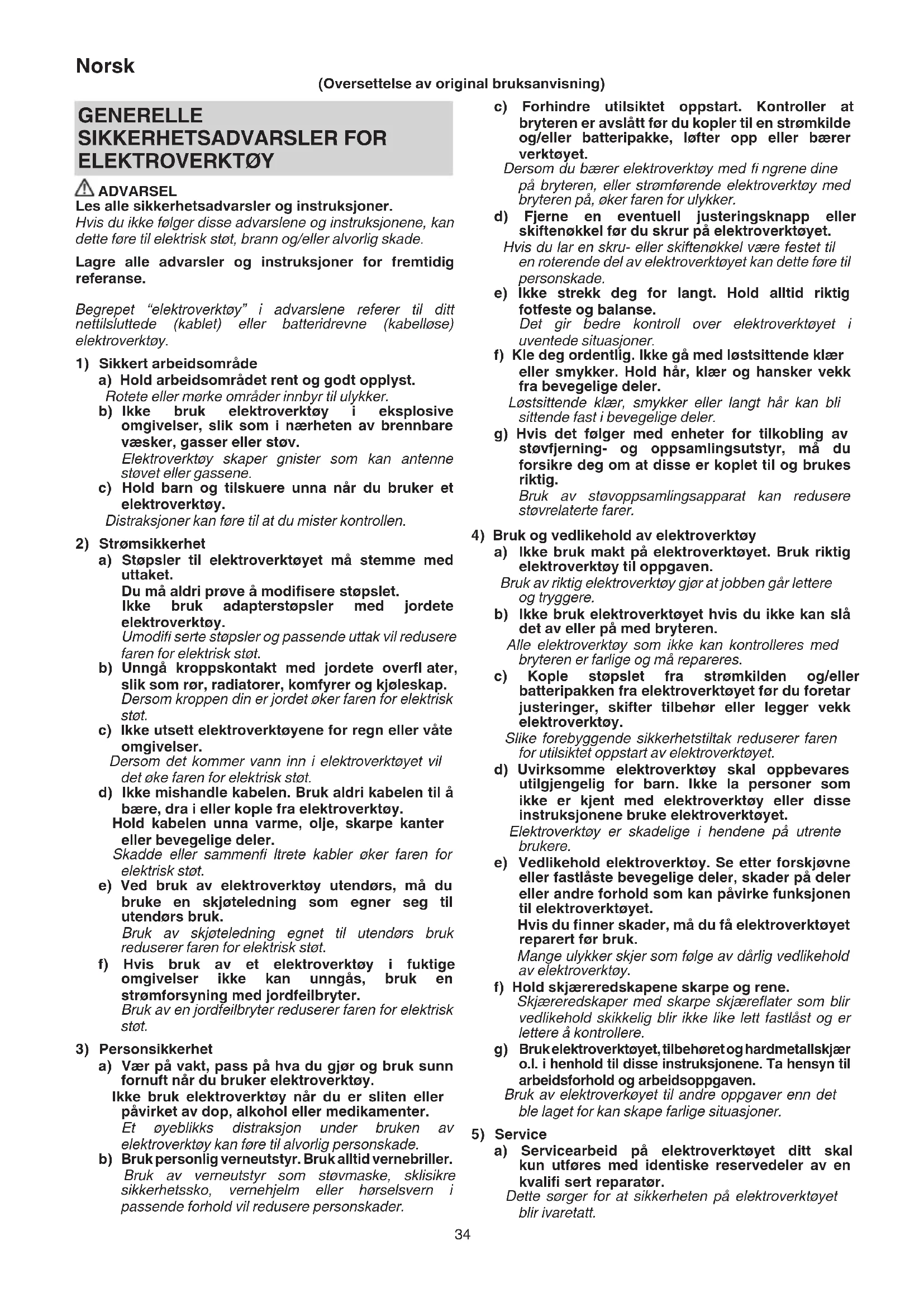 a) Servicearbeid på elektroverktøyet ditt skal kun utføres med identiske reservedeler av en kvalifi sert reparatør. Dette sørger for at sikkerheten på elektroverktøyet blir ivaretatt. GENERELLE SIKKERHETSADVARSLER FOR ELEKTROVERKTØY ADVARSEL Les alle sikkerhetsadvarsler og instruksjoner. Hvis du ikke følger disse advarslene og instruksjonene, kan dette føre til elektrisk støt, brann og/eller alvorlig skade. Lagre alle advarsler og instruksjoner for fremtidig referanse. Begrepet “elektroverktøy” i advarslene referer til ditt nettilsluttede (kablet) eller batteridrevne (kabelløse) elektroverktøy.
