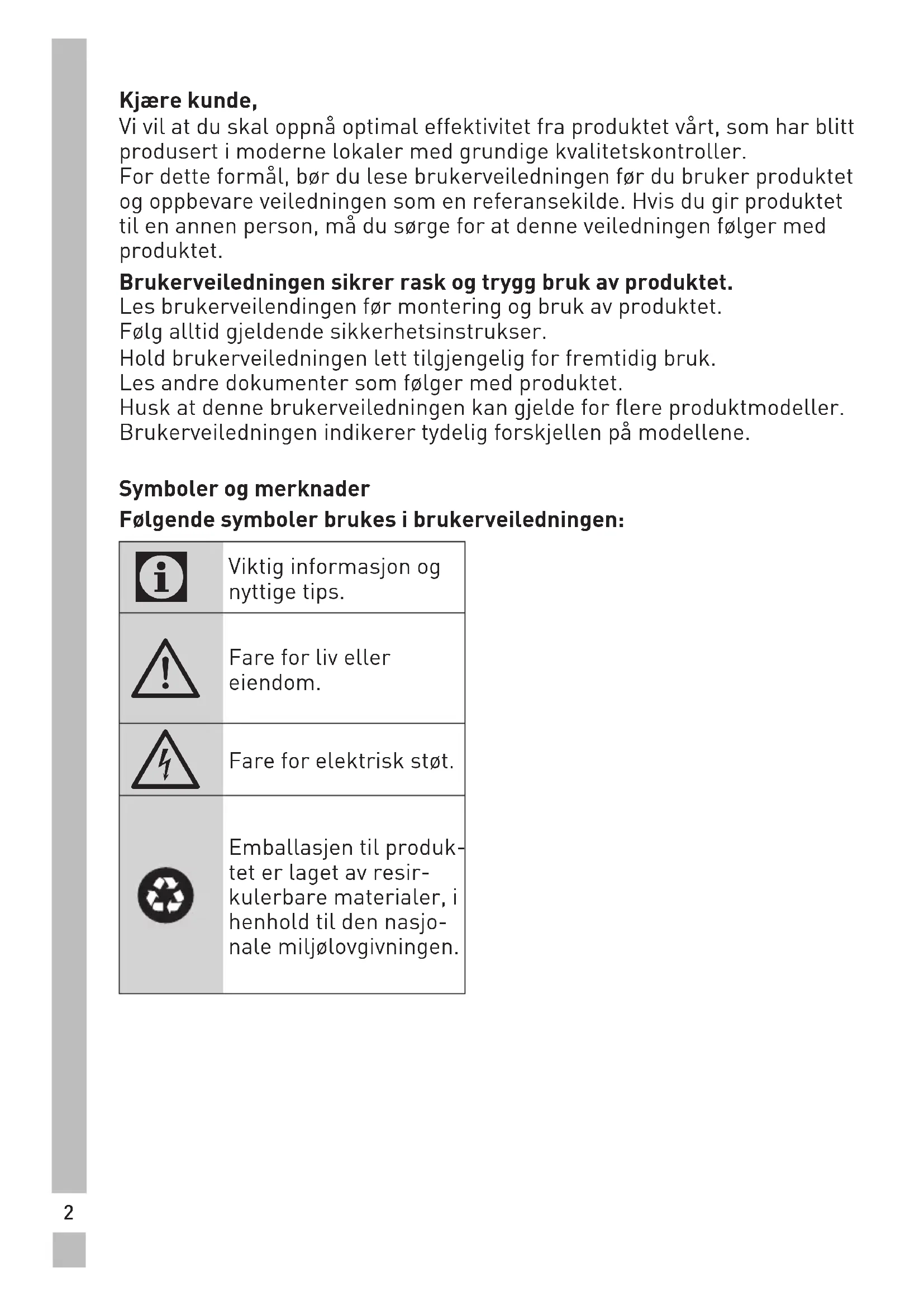 Emballasjematerialene til produktet er laget av resirkulerbare materialer i samsvar med våre nasjonale miljøforskrifter. Emballasjematerialene må ikke avhendes sammen med husholdningsavfall eller andre typer avfall. Ta dem til innsamlingssteder for emballasjematerialer utpekt av lokale myndigheter.7