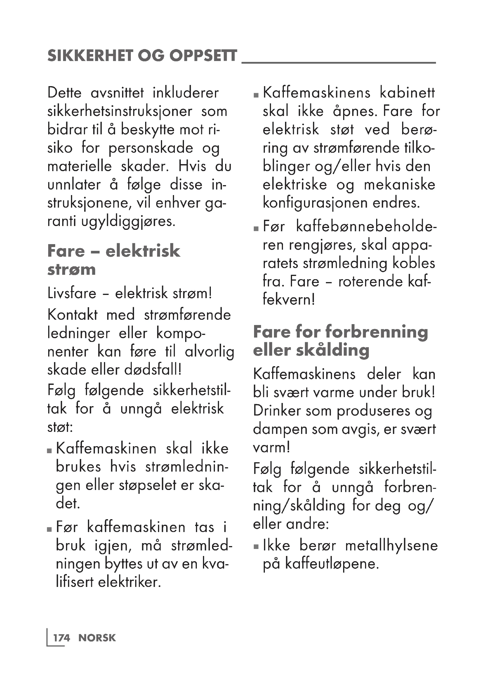 Før kaffebønnebeholde- ren rengjøres, skal appa- ratets strømledning kobles fra. Fare – roterende kaf- fekvern! Fare for forbrenning eller skålding Kaffemaskinens deler kan bli svært varme under bruk! Drinker som produseres og dampen som avgis, er svært varm! Følg følgende sikkerhetstil- tak for å unngå forbren- ning/skålding for deg og/ eller andre: