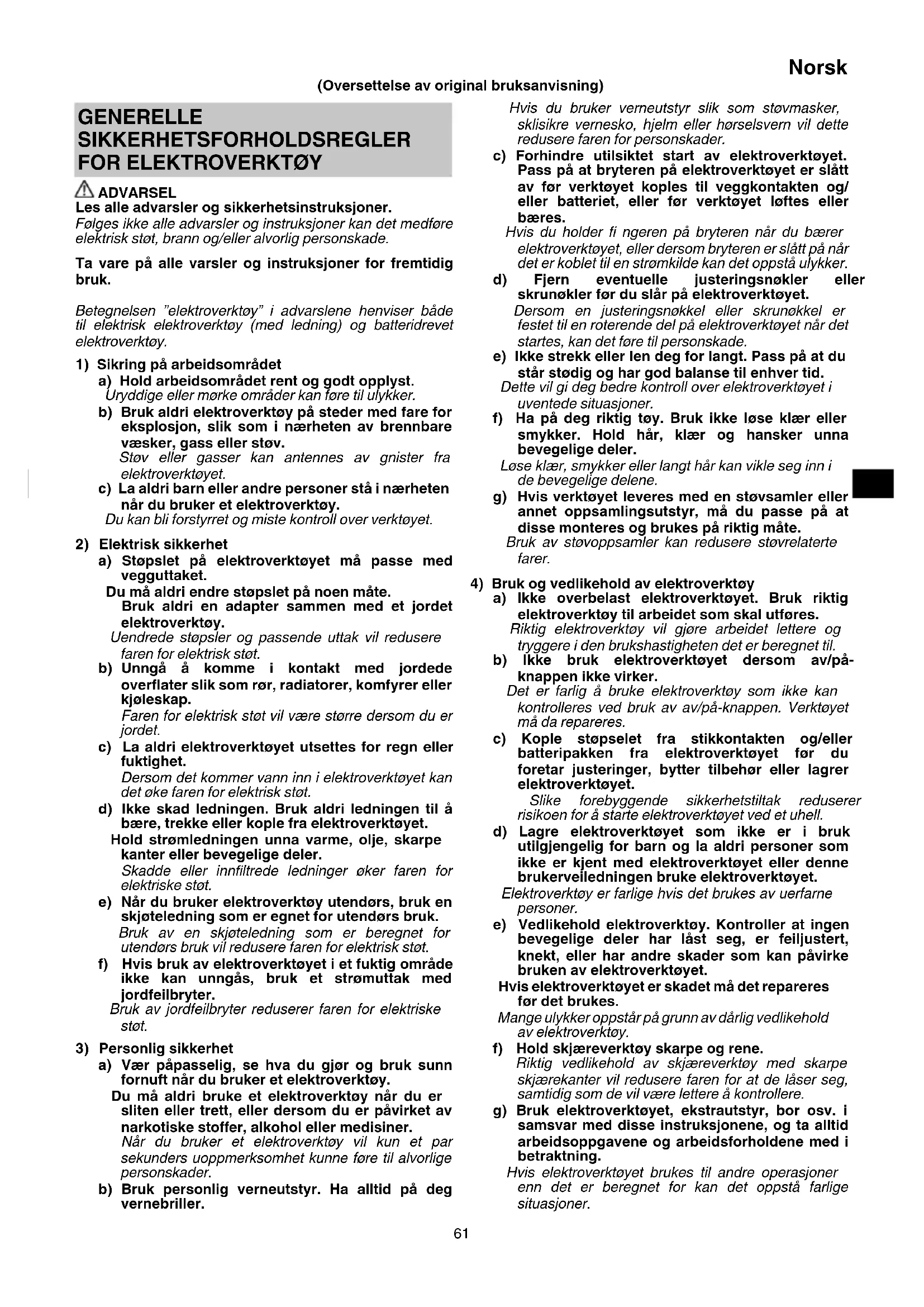 ADVARSEL Les alle advarsler og sikkerhetsinstruksjoner. Følges ikke alle advarsler og instruksjoner kan det medføre elektrisk støt, brann og/eller alvorlig personskade. Ta vare på alle varsler og instruksjoner for fremtidig bruk. Betegnelsen ”elektroverktøy” i advarslene henviser både til elektrisk elektroverktøy (med ledning) og batteridrevet elektroverktøy.