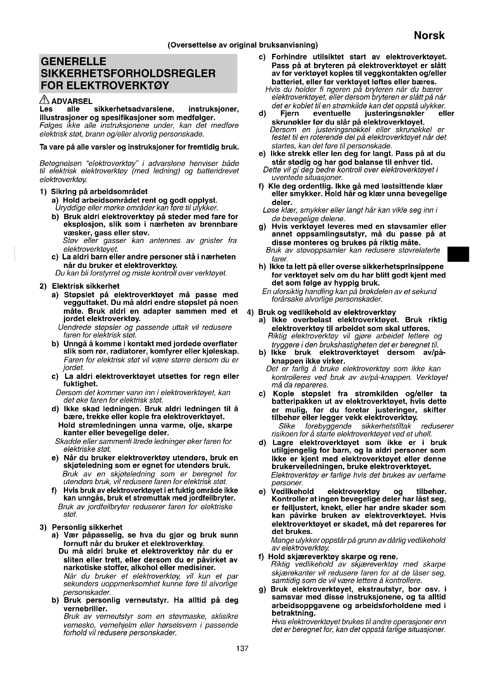 a) Ikke overbelast elektroverktøyet. Bruk riktig elektroverktøy til arbeidet som skal utføres. Riktig elektroverktøy vil gjøre arbeidet lettere og tryggere i den brukshastigheten det er beregnet til. b) Ikke bruk elektroverktøyet dersom av/på- knappen ikke virker. Det er farlig å bruke elektroverktøy som ikke kan kontrolleres ved bruk av av/på-knappen. Verktøyet må da repareres. c) Kople støpslet fra strømkilden og/eller ta batteripakken ut av elektroverktøyet, hvis dette er mulig, før du foretar justeringer, skifter tilbehør eller legger vekk elektroverktøy. Slike forebyggende sikkerhetstiltak reduserer risikoen for å starte elektroverktøyet ved et uhell. d) Lagre elektroverktøyet som ikke er i bruk utilgjengelig for barn, og la aldri personer som ikke er kjent med elektroverktøyet eller denne brukerveiledningen, bruke elektroverktøyet. Elektroverktøy er farlige hvis det brukes av uerfarne personer. e) Vedlikehold elektroverktøy og tilbehør. Kontroller at ingen bevegelige deler har låst seg, er feiljustert, knekt, eller har andre skader som kan påvirke bruken av elektroverktøyet. Hvis elektroverktøyet er skadet, må det repareres før det brukes. Mange ulykker oppstår på grunn av dårlig vedlikehold av elektroverktøy. f) Hold skjæreverktøy skarpe og rene. Riktig vedlikehold av skjæreverktøy med skarpe skjærekanter vil redusere faren for at de låser seg, samtidig som de vil være lettere å kontrollere. g) Bruk elektroverktøyet, ekstrautstyr, bor osv. i samsvar med disse instruksjonene, og ta alltid arbeidsoppgavene og arbeidsforholdene med i betraktning. Hvis elektroverktøyet brukes til andre operasjoner enn det er beregnet for, kan det oppstå farlige situasjoner. GENERELLE SIKKERHETSFORHOLDSREGLER
