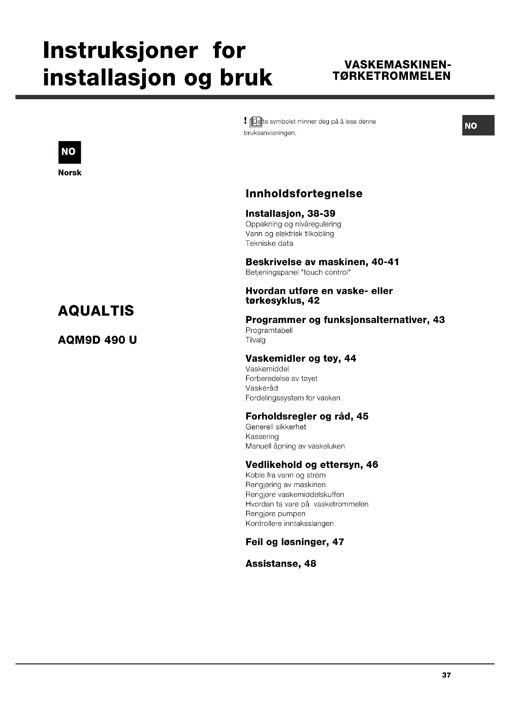 Norsk Innholdsfortegnelse Installasjon, 38-39 Oppakning og nivåreguleringVann og elektrisk tilkoblingTekniske data Beskrivelse av maskinen, 40-41 Betjeningspanel "touch control" Hvordan utføre en vaske- eller tørkesyklus, 42 Programmer og funksjonsalternativer, 43 ProgramtabellTilvalg Vaskemidler og tøy, 44 VaskemiddelForberedelse av tøyetVaskerådFordelingssystem for vasken Forholdsregler og råd, 45 Generell sikkerhetKasseringManuell åpning av vaskeluken Vedlikehold og ettersyn, 46 Koble fra vann og strømRengjøring av maskinenRengjøre vaskemiddelskuffenHvordan ta vare på vasketrommelenRengjøre pumpenKontrollere inntaksslangen Feil og løsninger, 47 Assistanse, 48