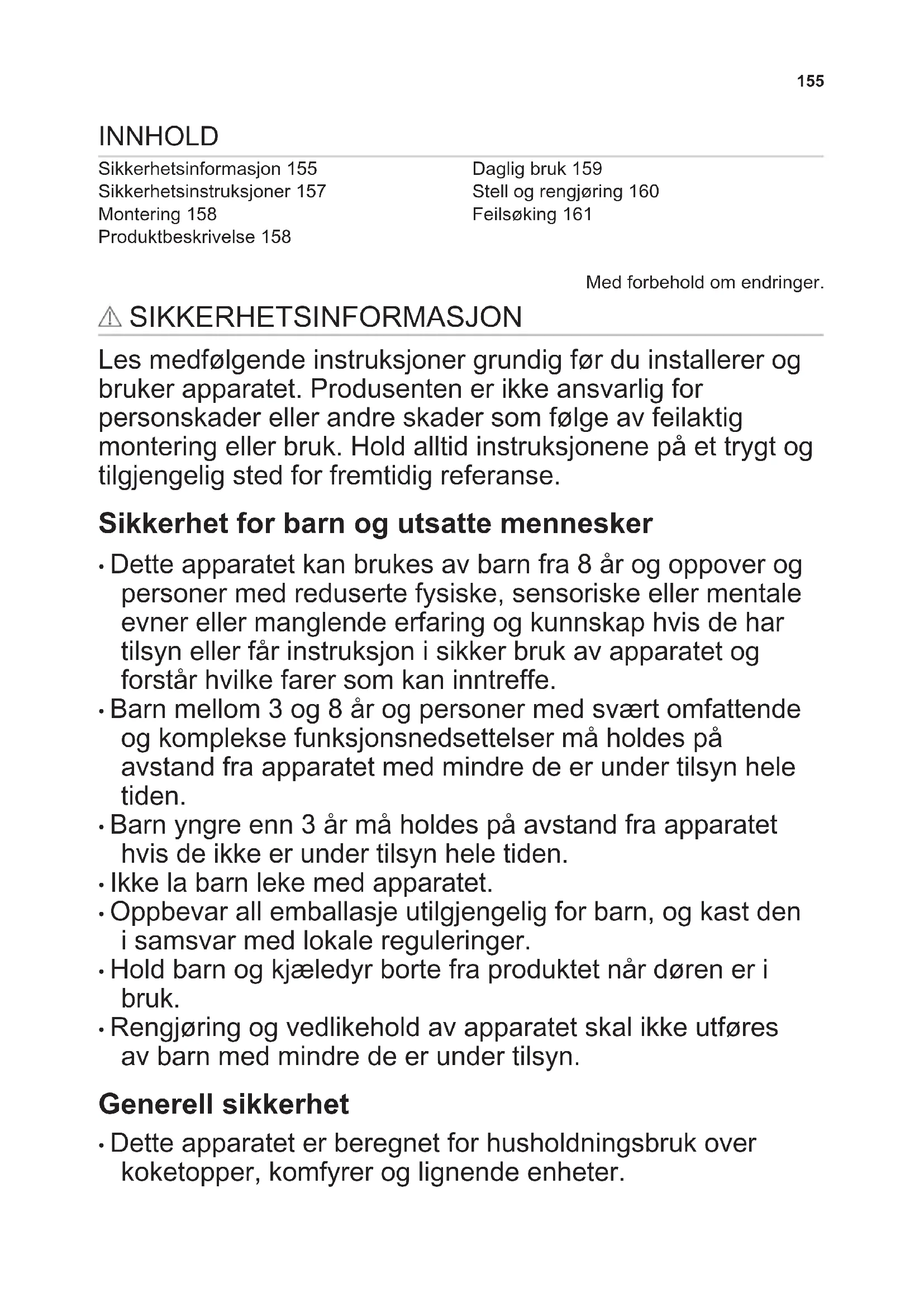 - Dette apparatet er beregnet for husholdningsbruk over koketopper, komfyrer og lignende enheter. 155• Trekk støpselet ut av stikkontakten før du utfører vedlikehold.