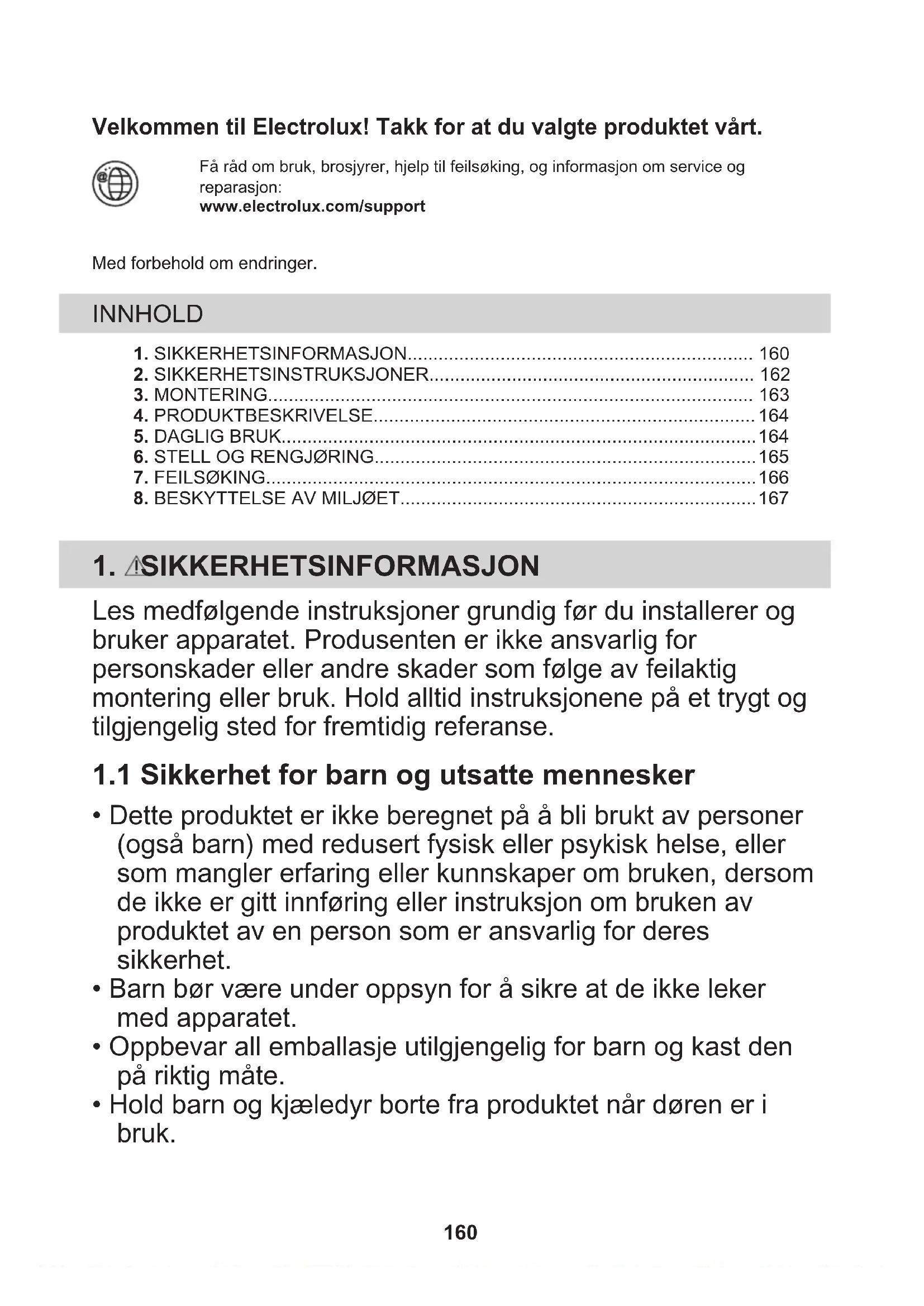 - Hold barn og kjæledyr borte fra produktet når døren er i bruk. 160• Rengjøring og vedlikehold av produktet skal ikke utføres av barn.