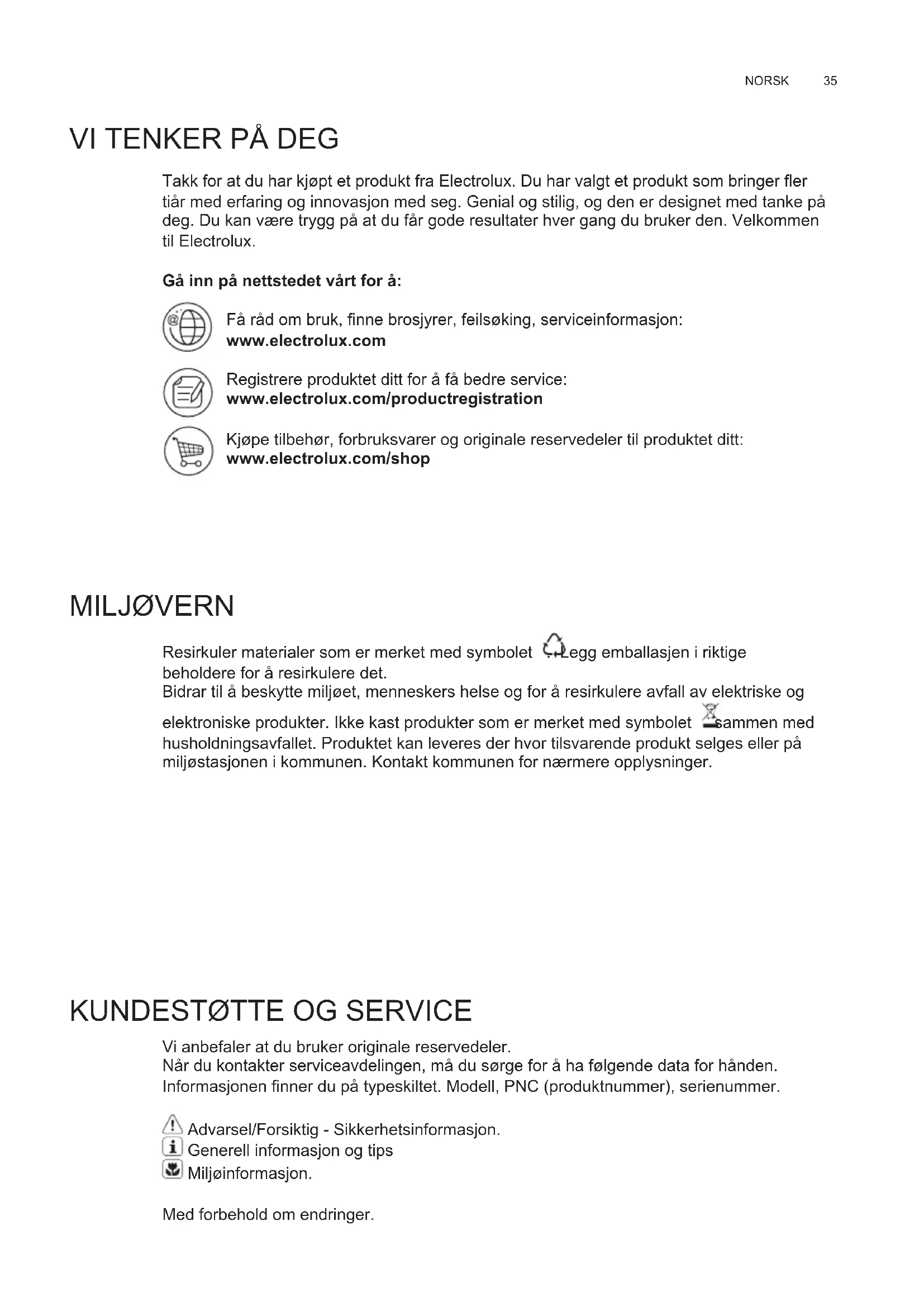 Vi anbefaler at du bruker originale reservedeler. Når du kontakter serviceavdelingen, må du sørge for å ha følgende data for hånden. Informasjonen finner du på typeskiltet. Modell, PNC (produktnummer), serienummer. Advarsel/Forsiktig - Sikkerhetsinformasjon. Generell informasjon og tips Miljøinformasjon. Med forbehold om endringer.