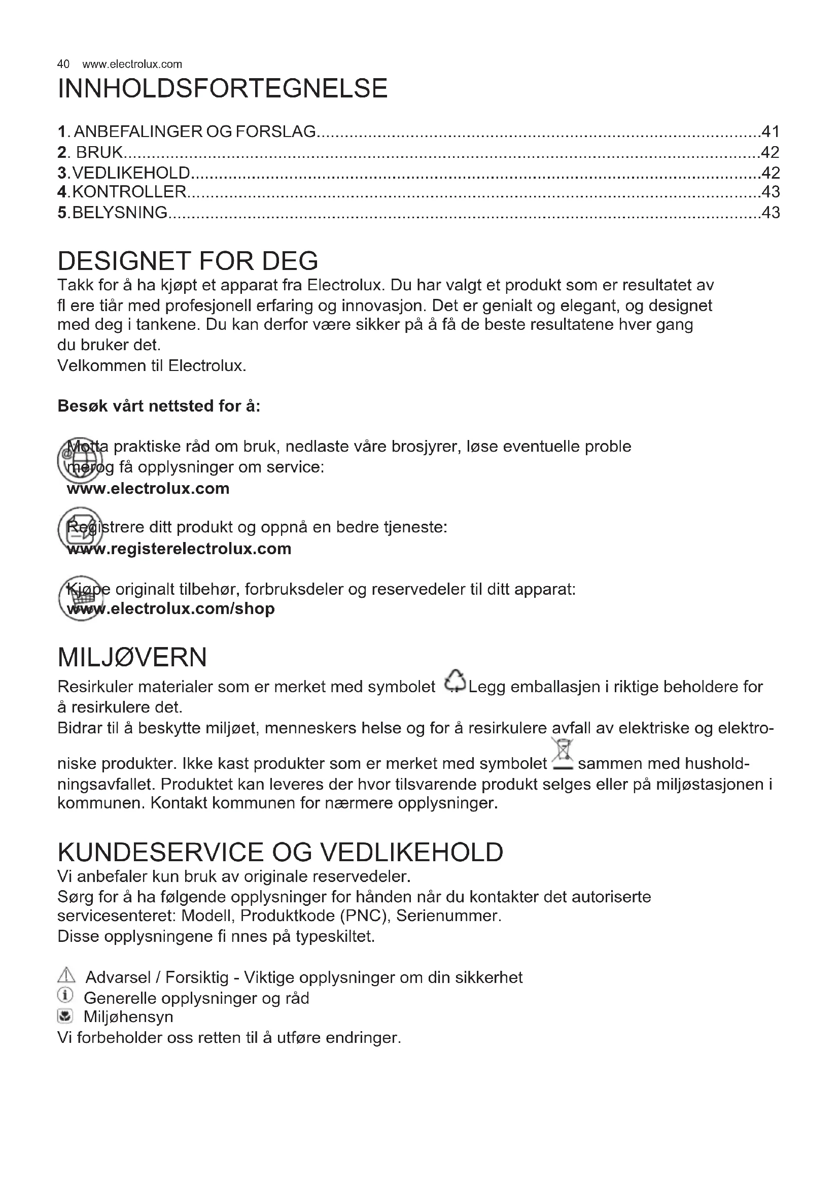Takk for å ha kjøpt et apparat fra Electrolux. Du har valgt et produkt som er resultatet av fl ere tiår med profesjonell erfaring og innovasjon. Det er genialt og elegant, og designet med deg i tankene. Du kan derfor være sikker på å få de beste resultatene hver gang du bruker det. Velkommen til Electrolux. Besøk vårt nettsted for å: Motta praktiske råd om bruk, nedlaste våre brosjyrer, løse eventuelle proble merog få opplysninger om service: www.electrolux.com Registrere ditt produkt og oppnå en bedre tjeneste: www.registerelectrolux.com Kjøpe originalt tilbehør, forbruksdeler og reservedeler til ditt apparat: www.electrolux.com/shop MILJØVERN Resirkuler materialer som er merket med symbolet .. Legg emballasjen i riktige beholdere for å resirkulere det. Bidrar til å beskytte miljøet, menneskers helse og for å resirkulere avfall av elektriske og elektro- niske produkter. Ikke kast produkter som er merket med symbolet sammen med hushold- ningsavfallet. Produktet kan leveres der hvor tilsvarende produkt selges eller på miljøstasjonen i kommunen. Kontakt kommunen for nærmere opplysninger.