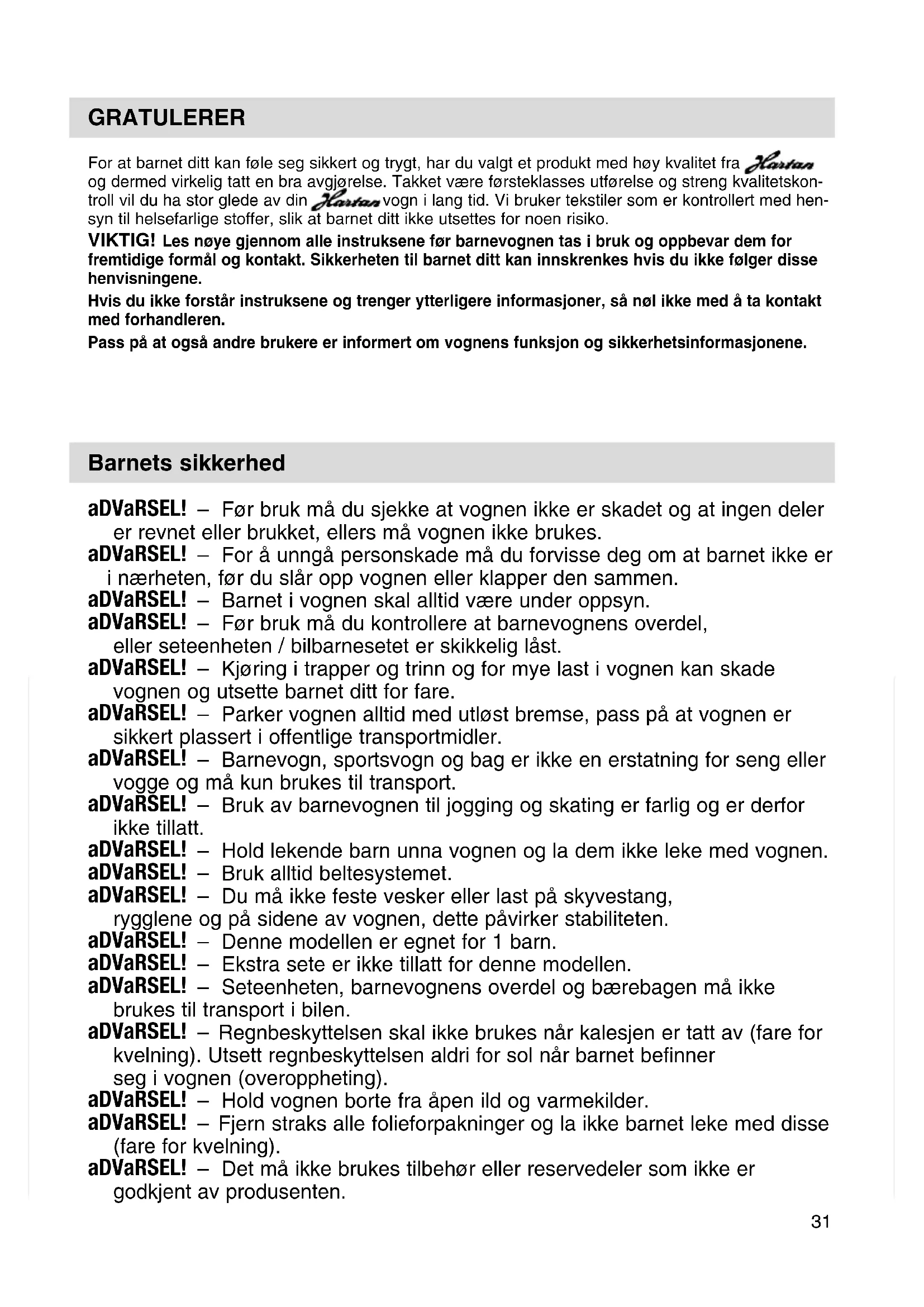 9GRATULERER For at barnet ditt kan føle seg sikkert og trygt, har du valgt et produkt med høy kvalitet fra og dermed virkelig tatt en bra avgjørelse. Takket være førsteklasses utførelse og streng kvalitetskon- troll vil du ha stor glede av din vogn i lang tid. Vi bruker tekstiler som er kontrollert med hen- syn til helsefarlige stoffer, slik at barnet ditt ikke utsettes for noen risiko. VIKTIG! Les nøye gjennom alle instruksene før barnevognen tas i bruk og oppbevar dem for fremtidige formål og kontakt. Sikkerheten til barnet ditt kan innskrenkes hvis du ikke følger disse henvisningene. Hvis du ikke forstår instruksene og trenger ytterligere informasjoner, så nøl ikke med å ta kontakt med forhandleren. Pass på at også andre brukere er informert om vognens funksjon og sikkerhetsinformasjonene. aDVarSEL! – Før bruk må du sjekke at vognen ikke er skadet og at ingen deler er revnet eller brukket, ellers må vognen ikke brukes. aDVarSEL! – For å unngå personskade må du forvisse deg om at barnet ikke er i nærheten, før du slår opp vognen eller klapper den sammen. aDVarSEL! – Barnet i vognen skal alltid være under oppsyn. aDVarSEL! – Før bruk må du kontrollere at barnevognens overdel, eller seteenheten / bilbarnesetet er skikkelig låst. aDVarSEL! – Kjøring i trapper og trinn og for mye last i vognen kan skade vognen og utsette barnet ditt for fare. aDVarSEL! – Parker vognen alltid med utløst bremse, pass på at vognen er sikkert plassert i offentlige transportmidler. aDVarSEL! – Barnevogn, sportsvogn og bag er ikke en erstatning for seng eller vogge og må kun brukes til transport. aDVarSEL! – Bruk av barnevognen til jogging og skating er farlig og er derfor ikke tillatt. aDVarSEL! – Hold lekende barn unna vognen og la dem ikke leke med vognen. aDVarSEL! – Bruk alltid beltesystemet. aDVarSEL! – Du må ikke feste vesker eller last på skyvestang, rygglene og på sidene av vognen, dette påvirker stabiliteten. aDVarSEL! – Denne modellen er egnet for 1 barn. aDVarSEL! – Ekstra sete er ikke tillatt for denne modellen. aDVarSEL! – Seteenheten, barnevognens overdel og bærebagen må ikke brukes til transport i bilen. aDVarSEL! – Regnbeskyttelsen skal ikke brukes når kalesjen er tatt av (fare for kvelning). Utsett regnbeskyttelsen aldri for sol når barnet befinner seg i vognen (overoppheting). aDVarSEL! – Hold vognen borte fra åpen ild og varmekilder. aDVarSEL! – Fjern straks alle folieforpakninger og la ikke barnet leke med disse (fare for kvelning). aDVarSEL! – Det må ikke brukes tilbehør eller reservedeler som ikke er godkjent av produsenten. Barnets sikkerhed