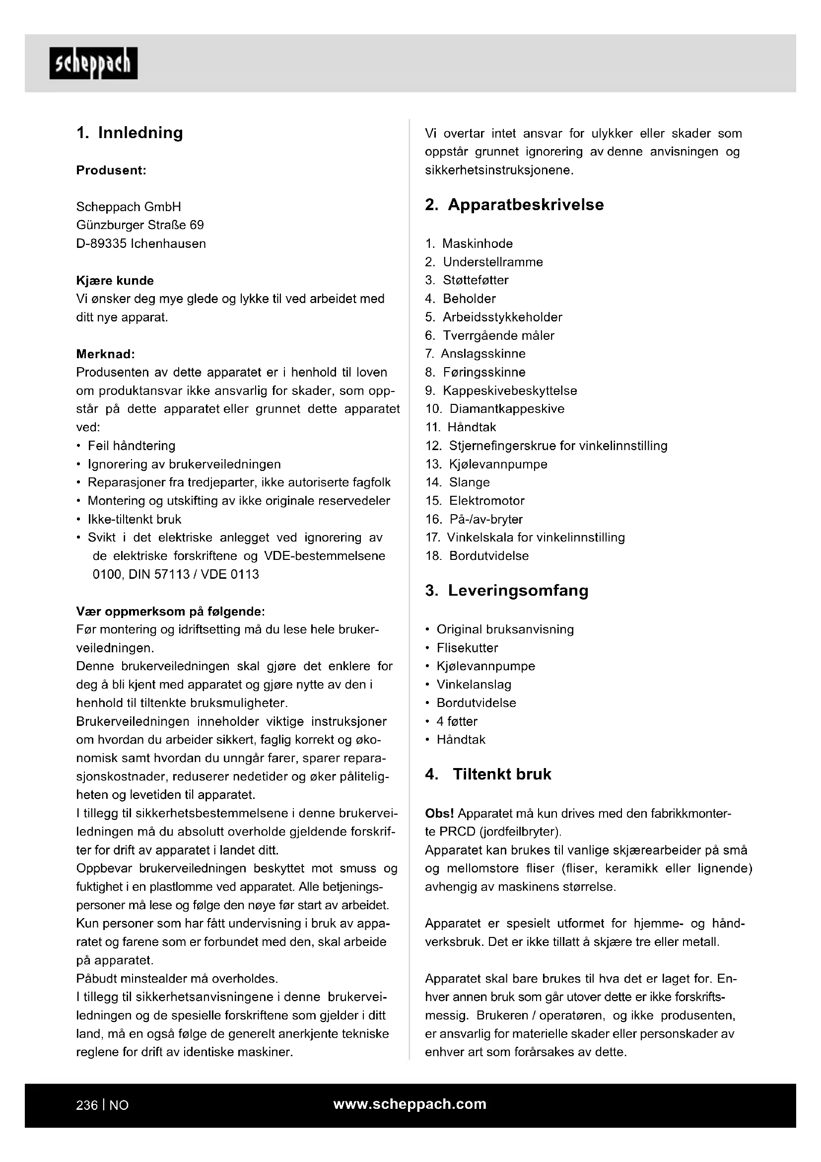 - Svikt i det elektriske anlegget ved ignorering av de elektriske forskriftene og VDE-bestemmelsene 0100, DIN 57113 / VDE 0113 Vær oppmerksom på følgende: Før montering og idriftsetting må du lese hele bruker- veiledningen. Denne brukerveiledningen skal gjøre det enklere for deg å bli kjent med apparatet og gjøre nytte av den i henhold til tiltenkte bruksmuligheter. Brukerveiledningen inneholder viktige instruksjoner om hvordan du arbeider sikkert, faglig korrekt og øko- nomisk samt hvordan du unngår farer, sparer repara- sjonskostnader, reduserer nedetider og øker pålitelig- heten og levetiden til apparatet. I tillegg til sikkerhetsbestemmelsene i denne brukervei- ledningen må du absolutt overholde gjeldende forskrif- ter for drift av apparatet i landet ditt. Oppbevar brukerveiledningen beskyttet mot smuss og fuktighet i en plastlomme ved apparatet. Alle betjenings- personer må lese og følge den nøye før start av arbeidet. Kun personer som har fått undervisning i bruk av appa- ratet og farene som er forbundet med den, skal arbeide på apparatet. Påbudt minstealder må overholdes. I tillegg til sikkerhetsanvisningene i denne brukervei- ledningen og de spesielle forskriftene som gjelder i ditt land, må en også følge de generelt anerkjente tekniske reglene for drift av identiske maskiner.www.scheppach.com